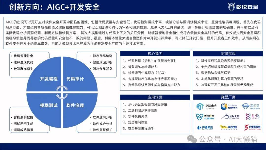 安全运营方面,AIGC技术通过智能分析与推理,优化了告警系统并提高了攻击识别精度。开发安全领域,AIGC技术的应用促进了代码的自动化审查和漏洞检测。