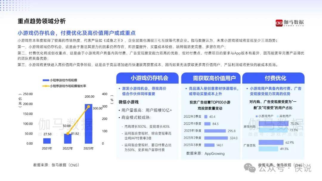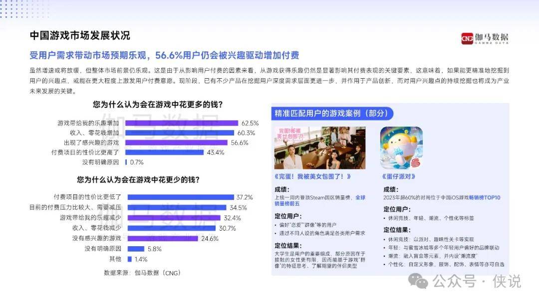 用户付费意愿受游戏乐趣的显著影响,而出海市场面临准入条件和隐私保护等挑战。小游戏、电竞、云技术等领域展现出新的增长机会。