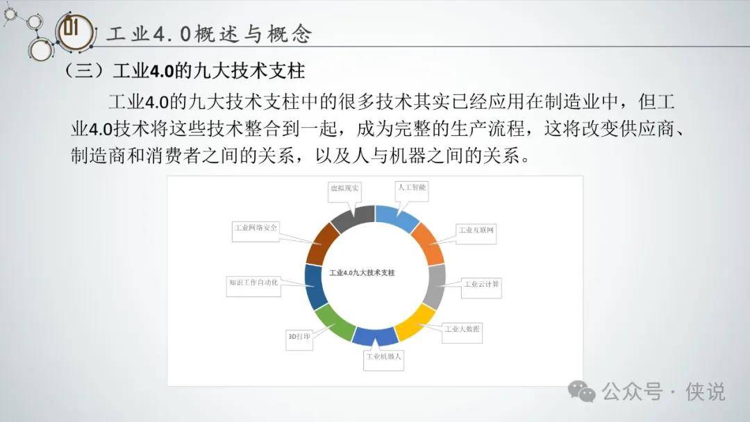 九大技术支柱包括人工智能、工业互联网、云计算、大数据、机器人、3D打印、知识工作自动化、网络安全和虚拟现实。