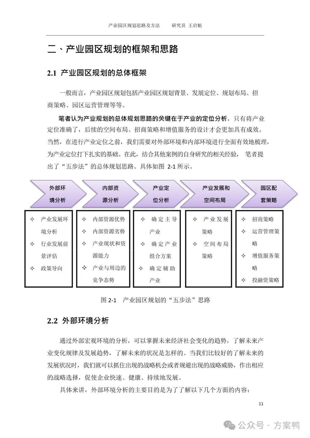 报告强调了产业园区规划的战略意义,并提出了“五步法”总体规划思路,包括外部环境分析、内部资源分析、产业定位分析、产业发展策略和空间布局、园区配套策略。