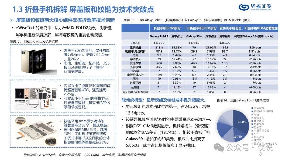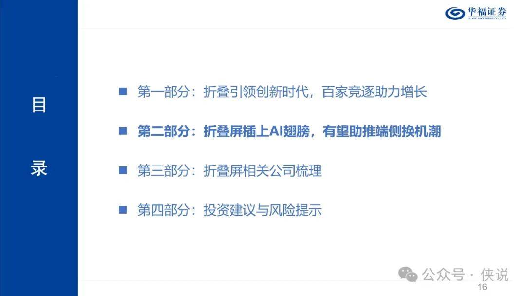 同时,报告也探讨了AI技术如何助力折叠屏手机在多任务处理和大屏幕应用方面发挥更大作用,并给出了投资建议,关注产业链中的关键技术和材料公司。