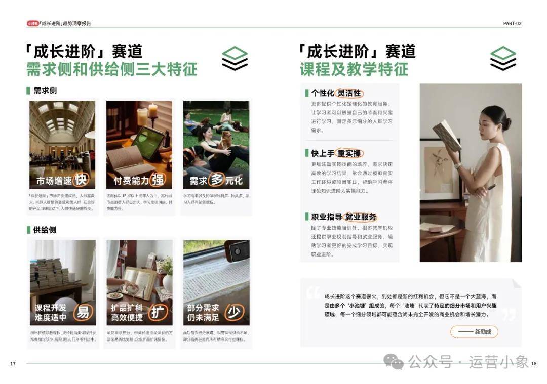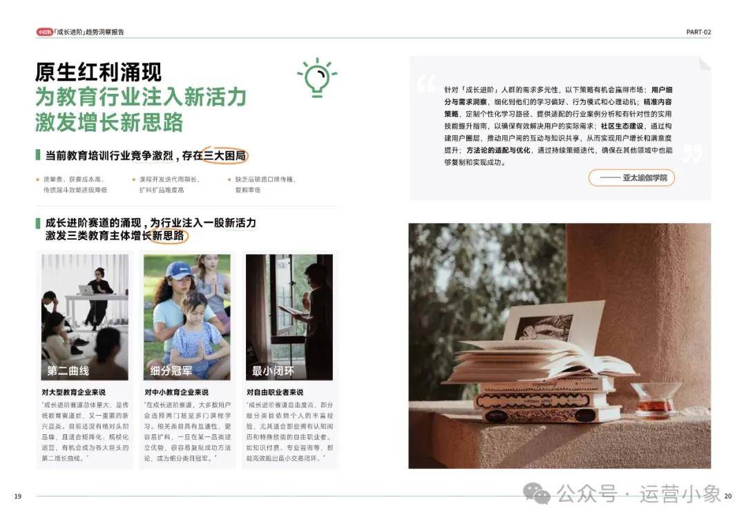 《2024小红书成长进阶趋势洞察报告》深入分析了成年人在教育和个人成长领域的新趋势。报告指出,成年人的学习动力被低估,他们追求成长和进步,愿意为自我提升投资。