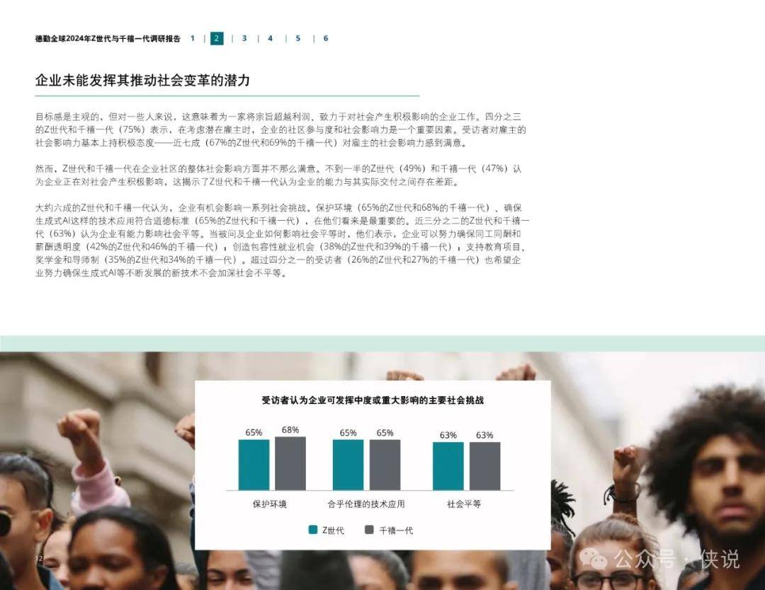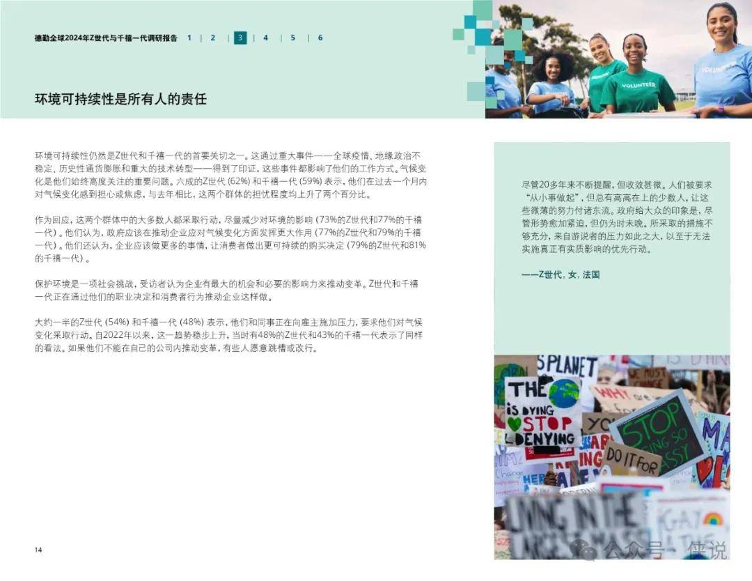 环境可持续性Z世代和千禧一代将环境保护视为他们身份的一部分。他们通过日常行动,如减少航空旅行、选择素食饮食,以及购买电动汽车,来推动气候行动。他们愿意为可持续产品支付更多,并且在工作中积极推动环保政策的实施。