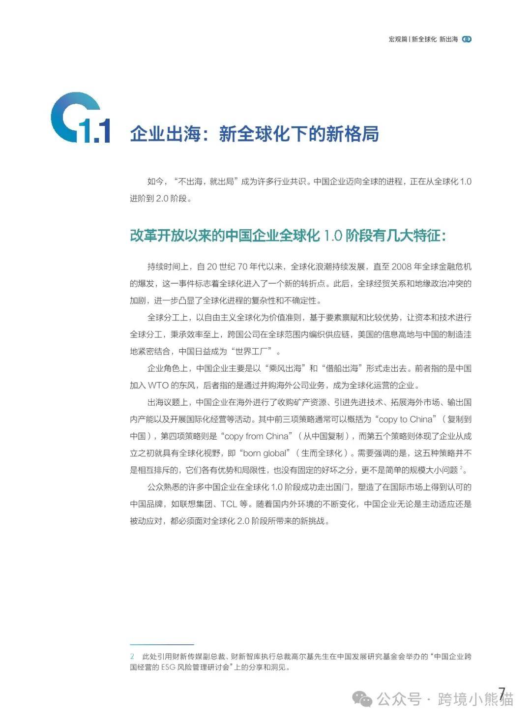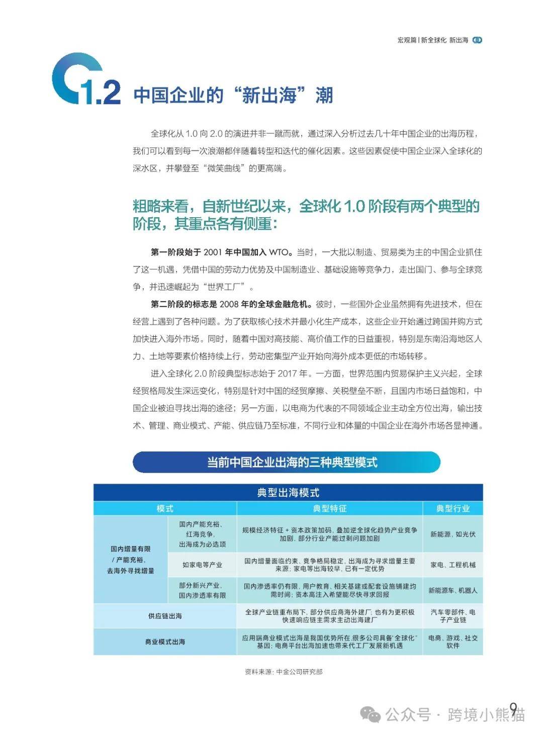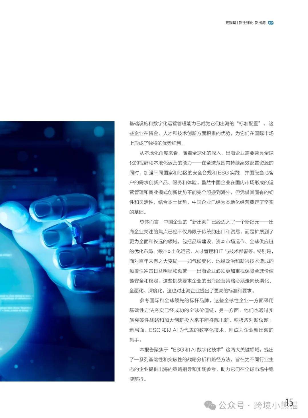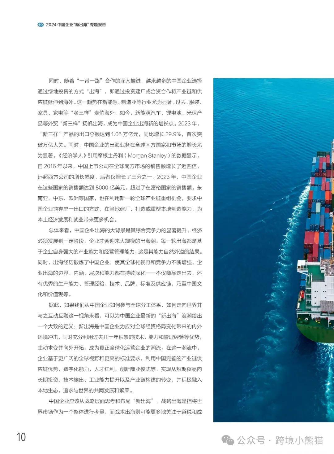 报告还指出,企业出海的新特点包括从“产品出海”到“品牌出海”和“产业链出海”,以及从“全球化思考,本地化运营”理念中获益。此外,报告强调,企业需要构建适应全球化的战略、运营模式和抗风险能力,以应对多元和多变的市场需求。