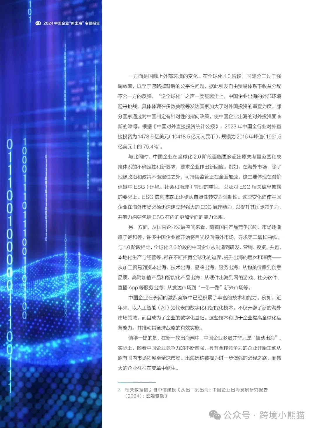 《2024中国企业“新出海”专题报告》深入探讨了中国企业全球化的新趋势和挑战。报告分析了全球化2.0时代的特征,强调ESG(环境、社会和公司治理)和AI(人工智能)在推动企业全球化中的关键作用。