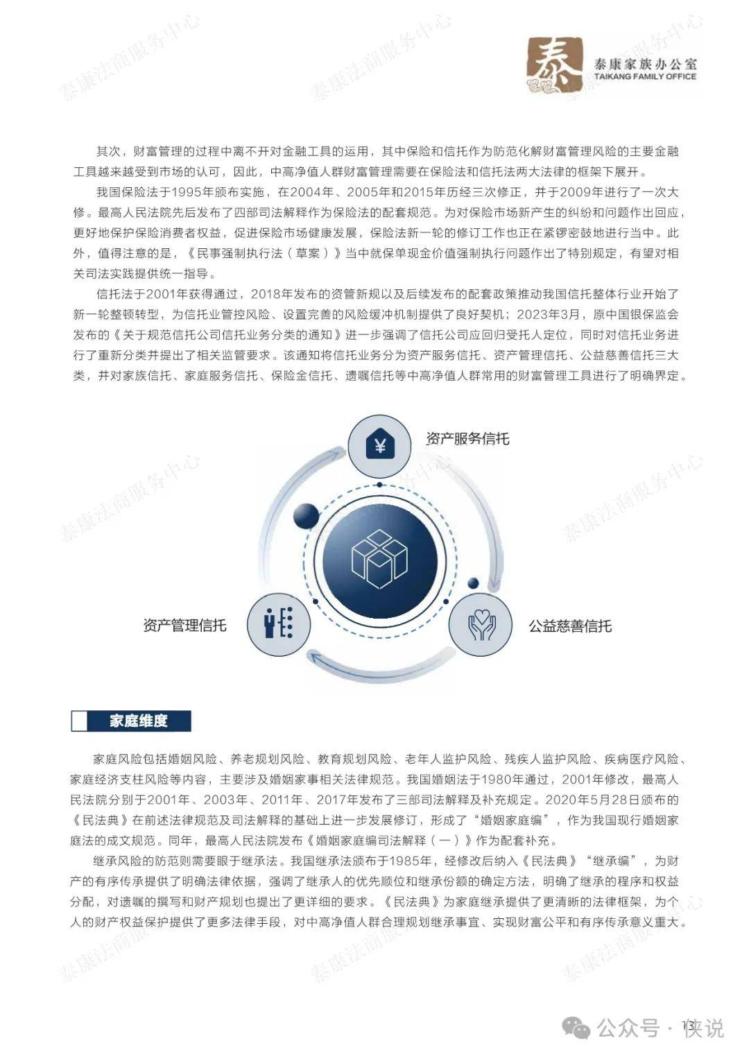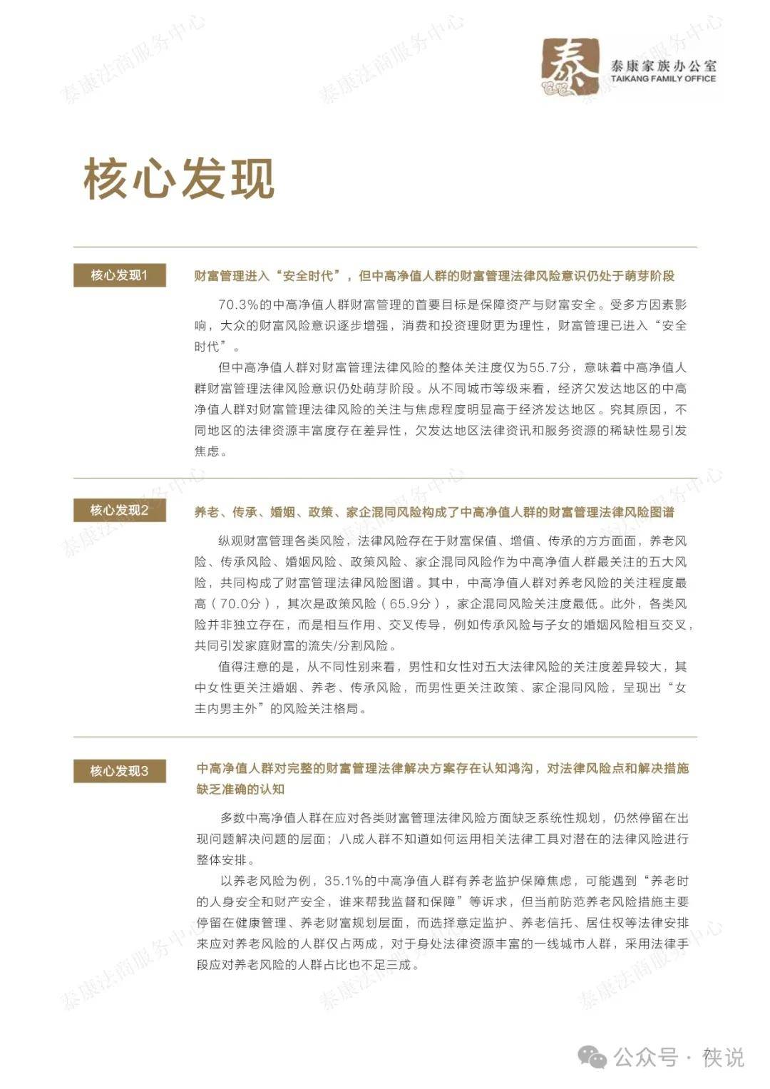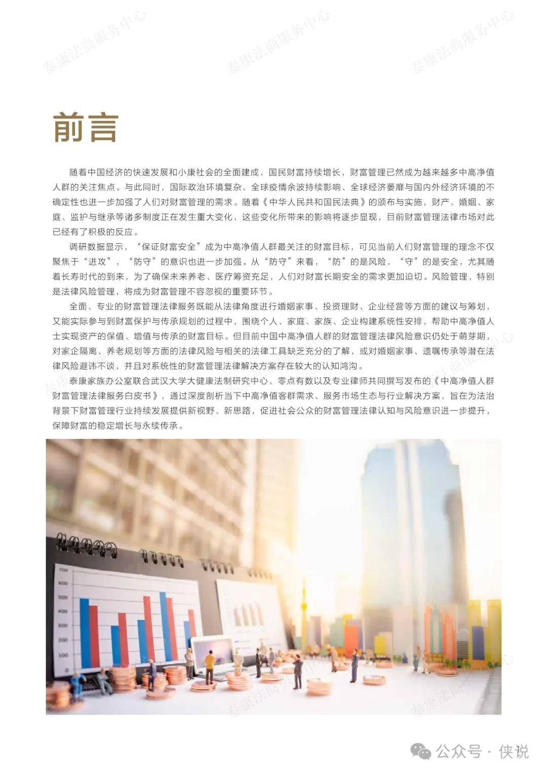 《中高净值人群财富管理法律服务白皮书》由泰康法商服务中心联合多方机构发布,深入分析了中高净值人群在财富管理方面的法律需求。报告指出,随着财富的增长,人们对财产保护、传承和风险管理的需求日益增加。