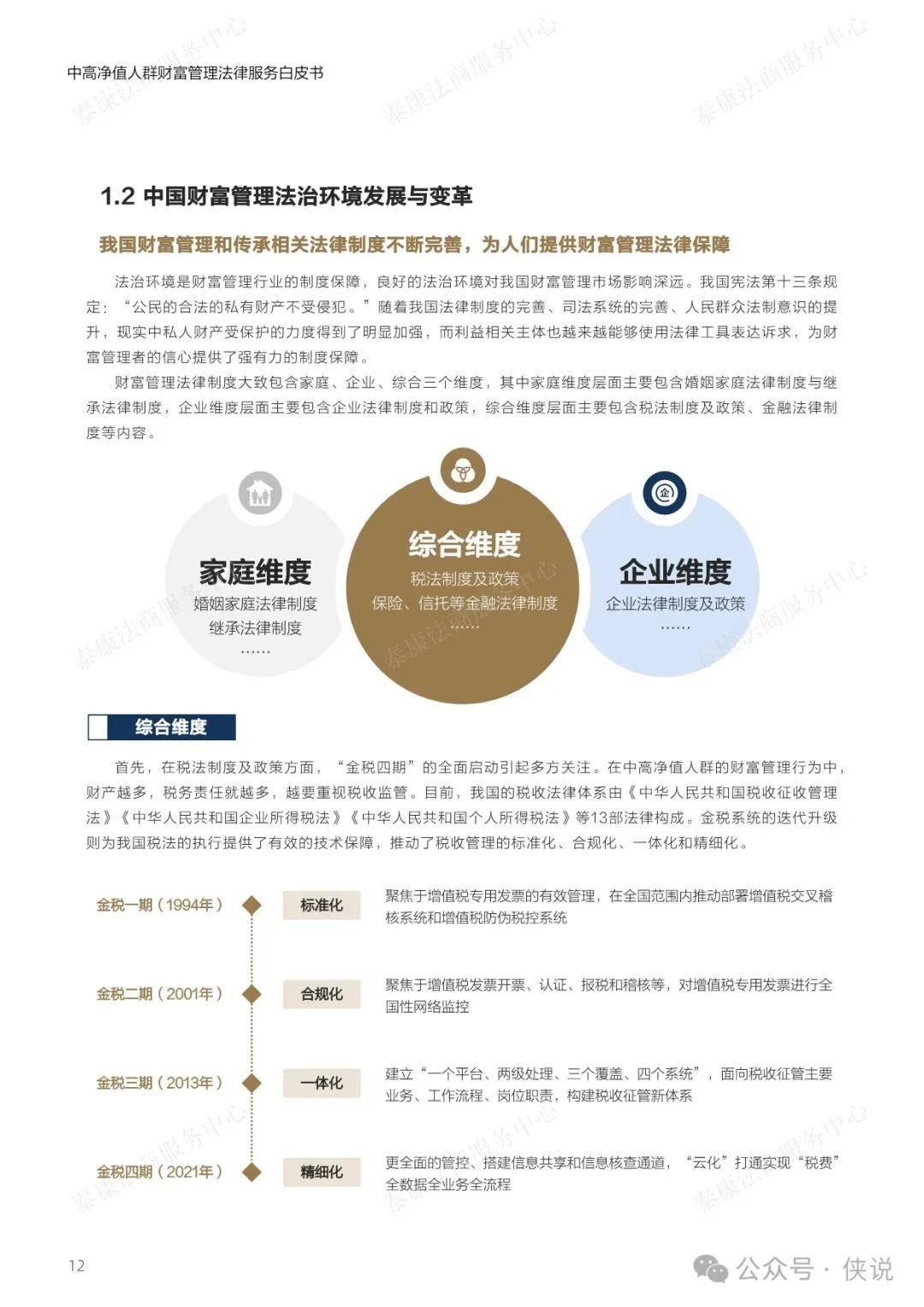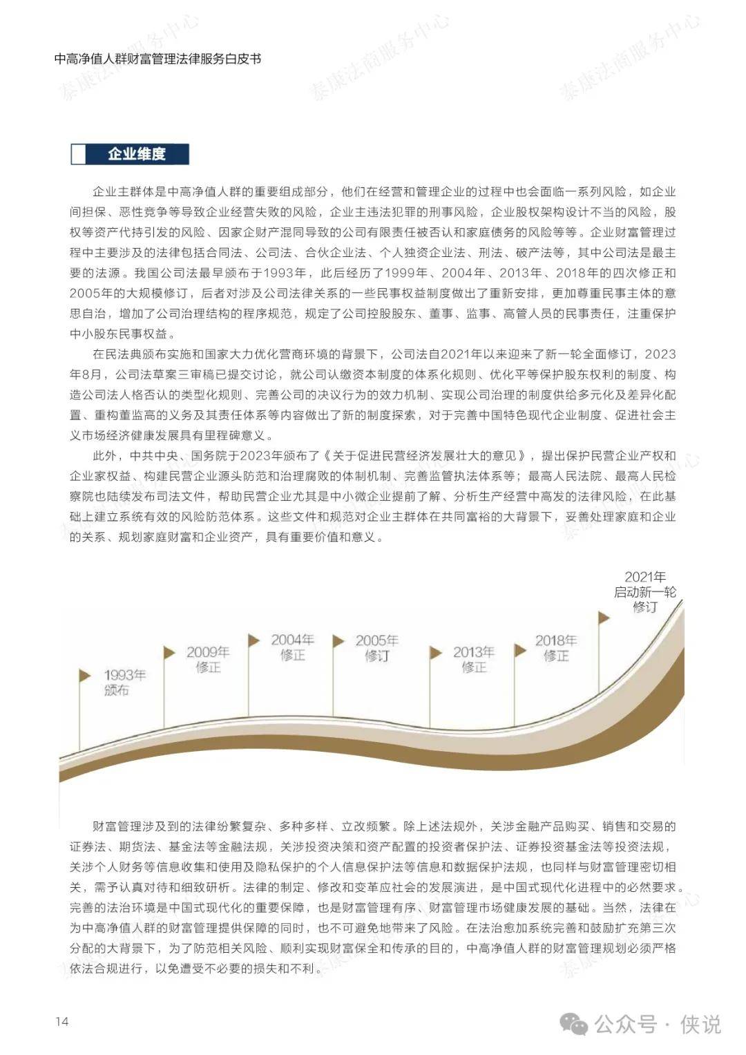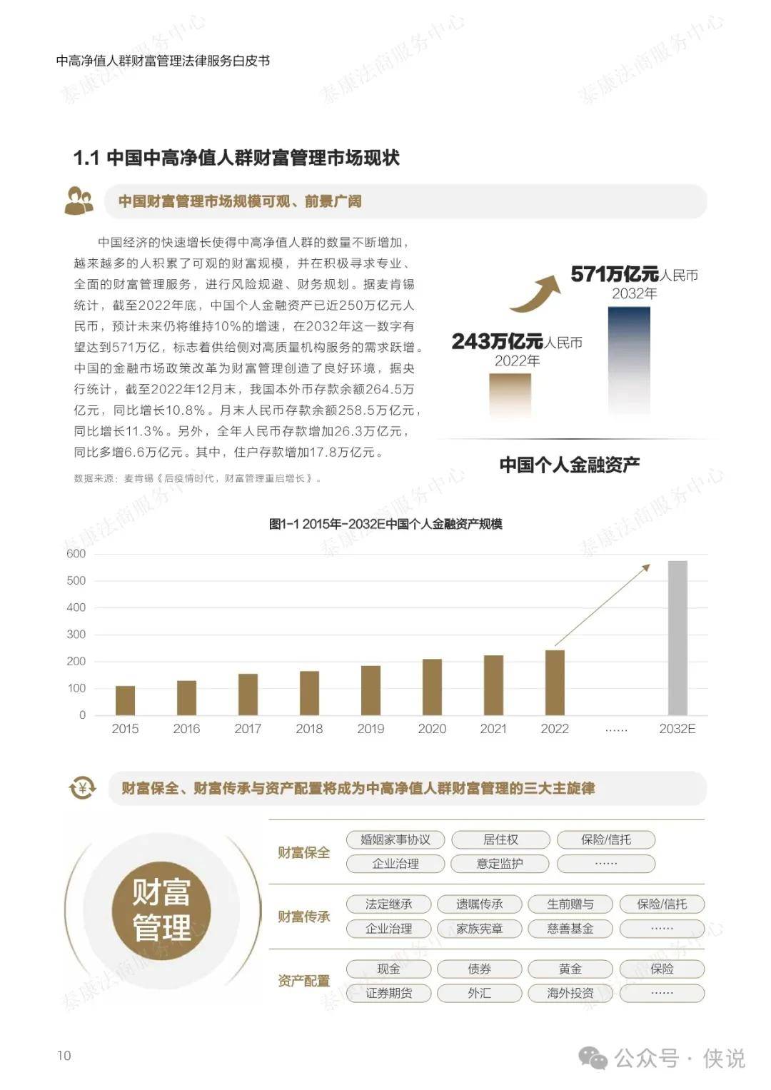 《中高净值人群财富管理法律服务白皮书》由泰康法商服务中心联合多方机构发布,深入分析了中高净值人群在财富管理方面的法律需求。报告指出,随着财富的增长,人们对财产保护、传承和风险管理的需求日益增加。