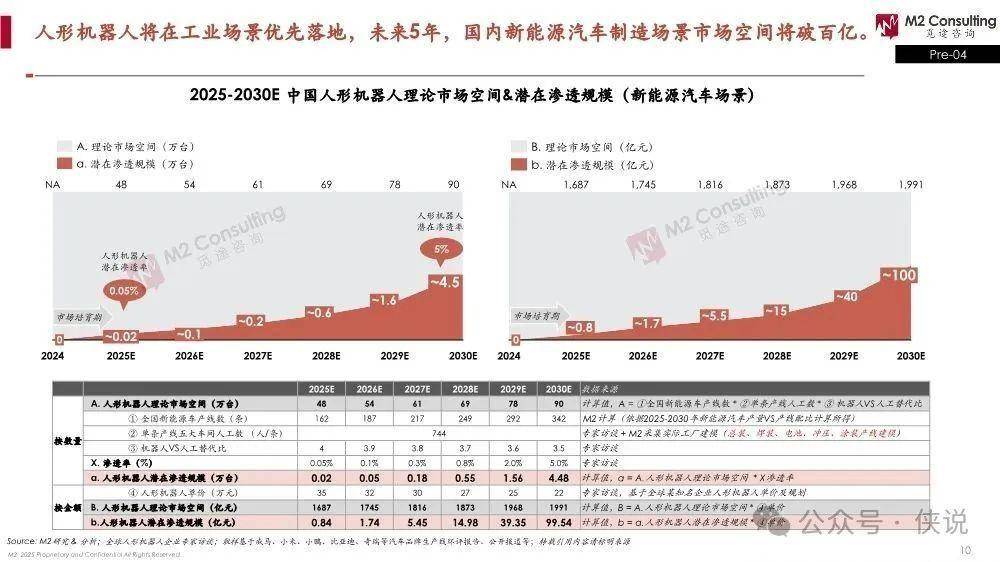 落地场景:工业场景会最先落地,尤其是国内新能源汽车制造场景,未来5年市场空间能破百亿。比如2030年,仅这个场景的潜在渗透规模就有4.48万台,对应近百亿(99.54亿元)的市场。