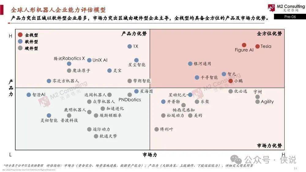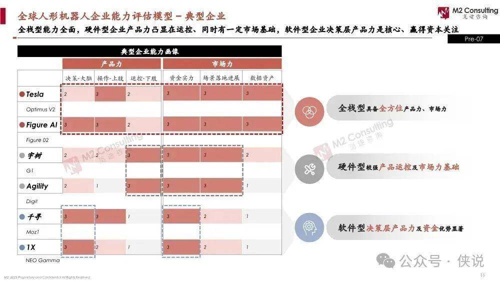 企业能力特点:全栈型企业是全方位优势,产品力和市场力都强;软件型企业产品力突出(尤其大脑决策);硬件型企业市场力更主导(有一定市场基础,产品力里下肢运控强)。