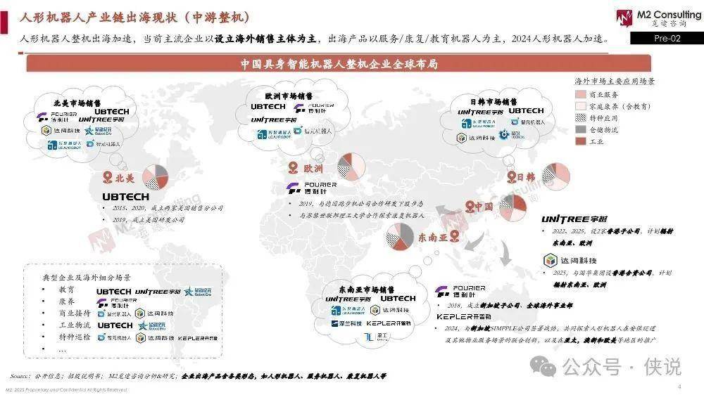 中游整机:整机出海现在越来越快,主流企业大多是先在海外设销售主体。目前出海的产品主要是服务、康复、教育类机器人,2024年人形机器人的出海速度明显加快了。