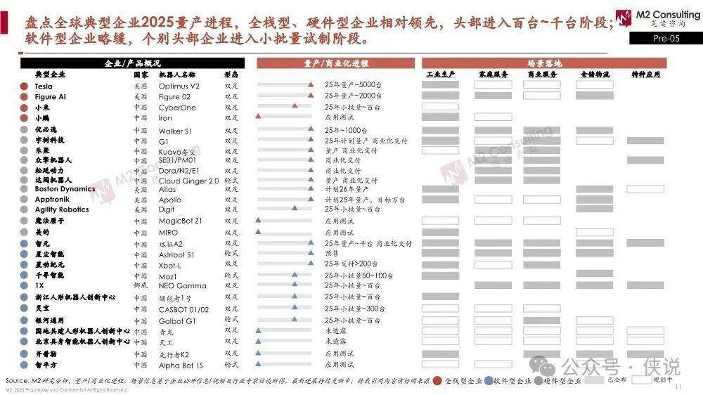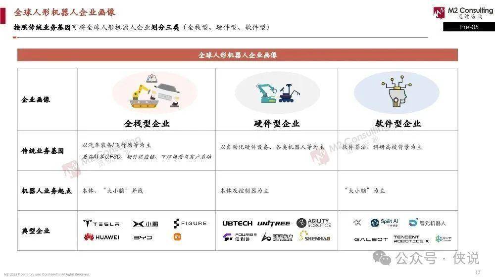 企业分类:按传统业务基因,全球企业分三类——全栈型(比如特斯拉、小鹏),有AI算法、硬件供应链、下游场景基础;硬件型(比如智元机器人、宇树),以自动化硬件、机器人为主,侧重本体和控制器;软件型(比如千寻智能、1X),靠软件算法或科研背景,侧重“大小脑”。