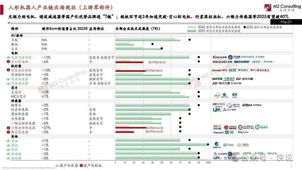 上游零部件:咱们国内有优势的品牌已经冲进“T链”了,比如无框力矩电机、谐波减速器这些。不过还有短板,像空心杯电机、行星滚柱丝杠、六维力传感器这些,好消息是近3年一直在加速突破,2025年国产化率有望超过40%。