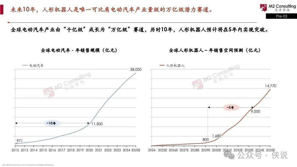 市场规模:人形机器人是个大赛道!未来10年,它是唯一能比肩电动汽车的万亿级潜力领域。电动汽车从千亿到万亿用了10年,而人形机器人预计5年就能实现突破。