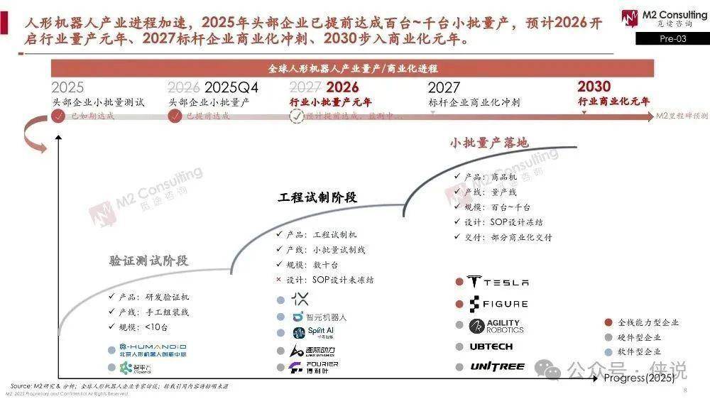 量产进度:2025年头部企业已经提前达成百台到千台的小批量产,比预期快。接下来的节奏很清晰:2026年是行业量产元年,2027年标杆企业会冲刺商业化,2030年就能步入商业化元年。