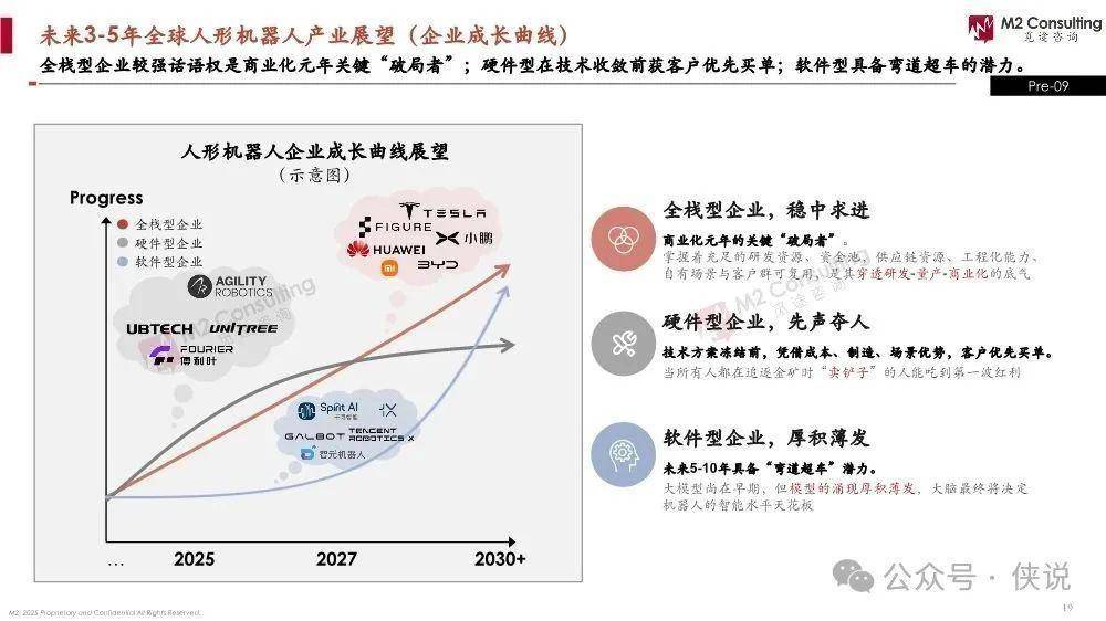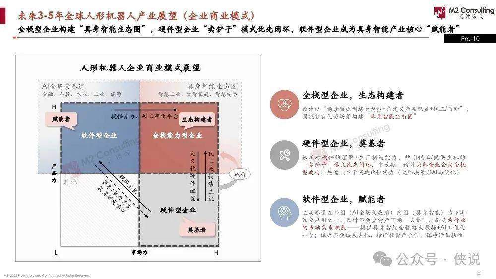 未来3-5年,全栈型是商业化破局者,硬件型先获客户订单,软件型有弯道超车潜力,商业模式分别为生态构建、卖铲子、赋能者模式。M2具身智能研究院则通过报告、数据、咨询赋能全产业链。
