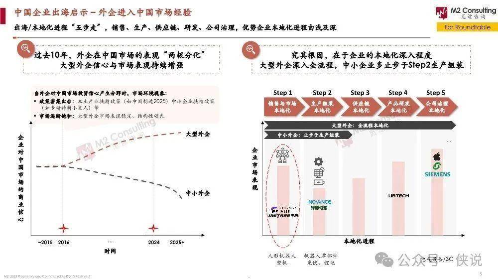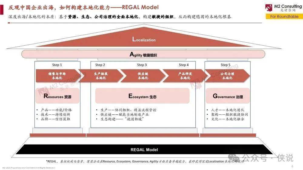 出海经验借鉴:外企进中国市场有个“五步走”的本地化流程,从销售市场、生产组装,到供应链、产品研发,最后是公司治理,做得好的大企业都是全流程本地化,中小企业大多只做到生产组装。反过来,咱们中国企业出海,得靠“REGAL模型”构建本地化能力,核心是资源(产品、技术、品牌)、生态(供应链赋能、抱团合作)、治理(本地人才、组织架构)、敏捷组织,最终实现深度本地化。