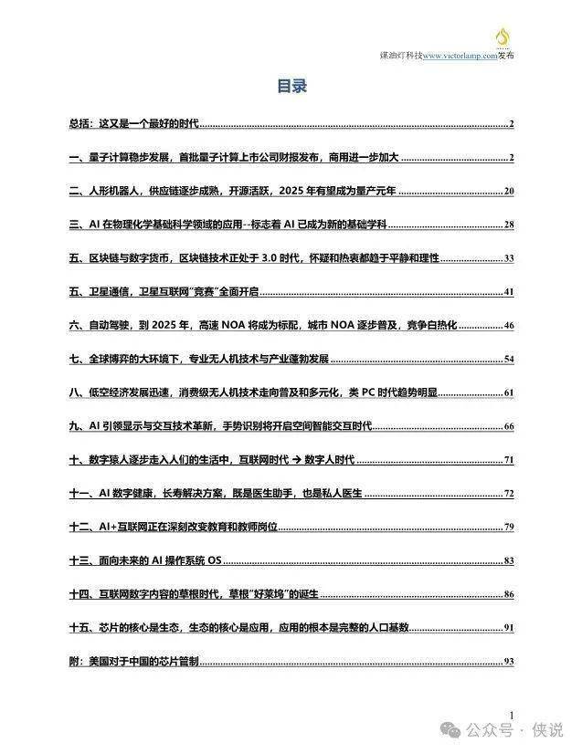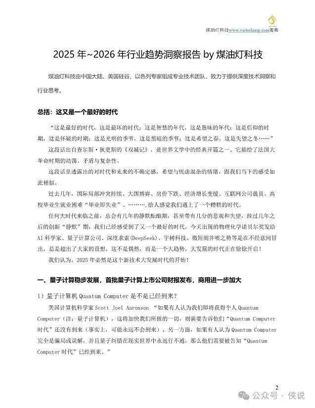 《2025年-2026年度高科技行业趋势洞察报告》由煤油灯科技发布,聚焦15个高科技领域,指出2025年是新技术大发展时代的起点。尽管当下有国际博弈、经济增速放缓等挑战,但量子计算、人形机器人、AI等领域已现突破。
