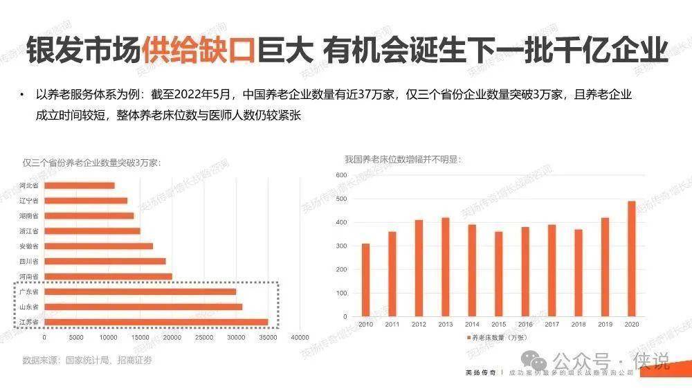 供给缺口大:以养老服务为例,全国养老企业近37万家,但仅3个省份企业数超3万家,养老床位和医师数量仍紧张,有机会诞生千亿级企业。