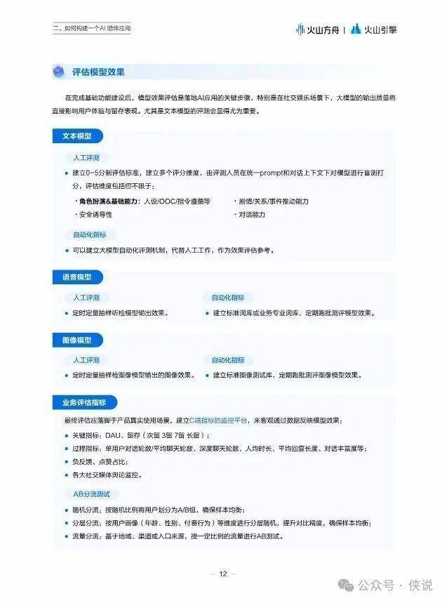 评估模型效果:文本模型按0 - 5分评人设贴合度、对话能力等;语音和图像模型抽样检查;最终看用户数据,比如日活、留存、对话轮数;