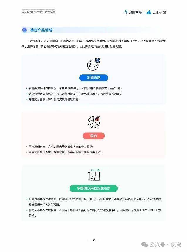 地域:国内要注意内容安全、算法备案;出海要适配语言、文化,符合当地法规,很多团队会国内外同时布局;