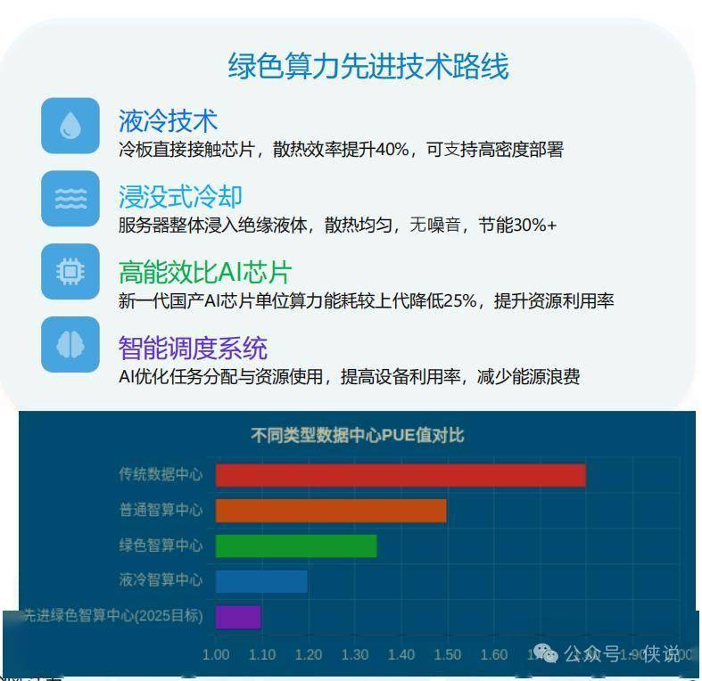 怎么做到?一方面靠技术:液冷、浸没式冷却能把PUE降到1.2,比传统机房省30%电;另一方面靠能源:西部的算力中心用风电、水电,东部买绿电,上海有些智算园区已经有50%的电来自清洁能源了。