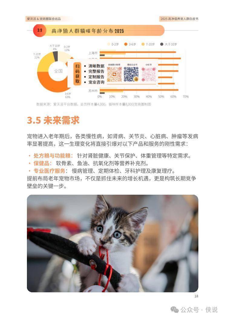 “银发猫”经济爆发在即:高净值人群的猫咪平均年龄已近5岁,这意味着未来3-5年,针对老年猫的处方粮、保健品、专业医疗护理需求将井喷!广州的“高龄猫”比例最高。