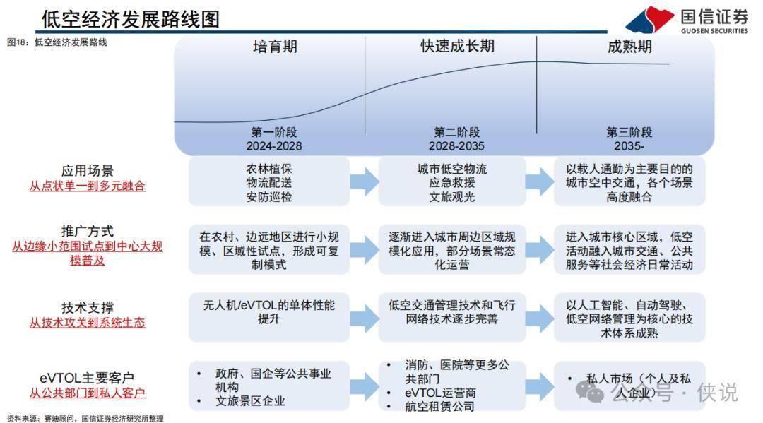 国信证券的报告里有个比喻很贴切: 低空经济的成长期节奏会比新能源汽车更快,因为它能复用新能源汽车的电池、电机技术,还能借助5G、北斗导航的成熟体系。