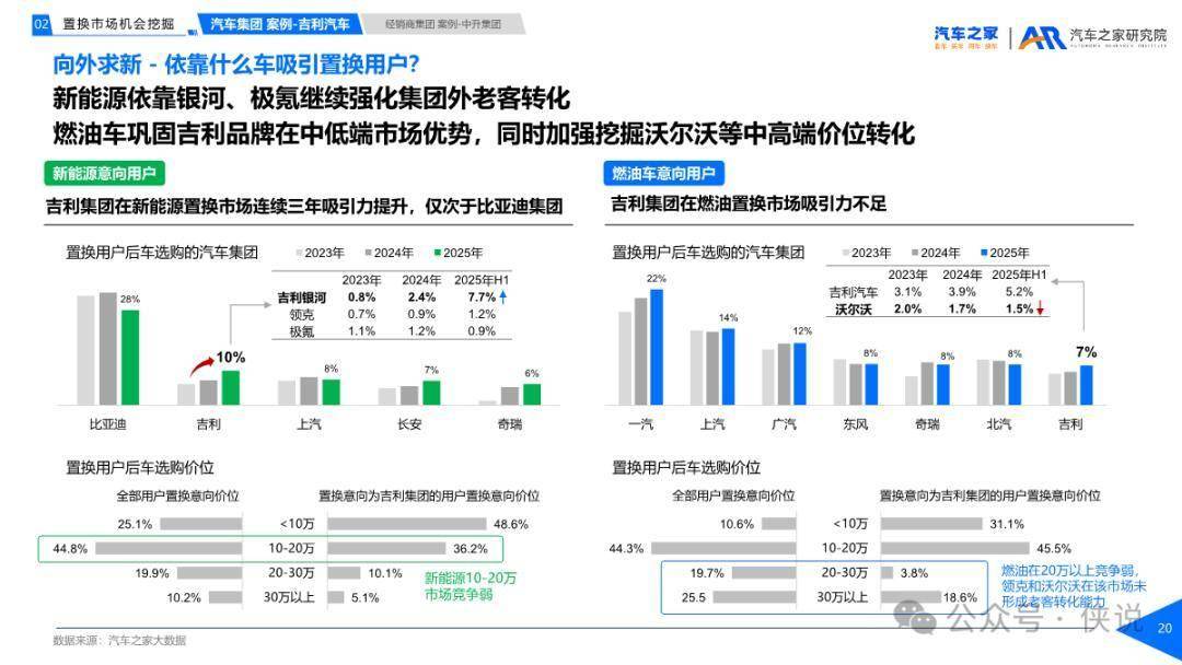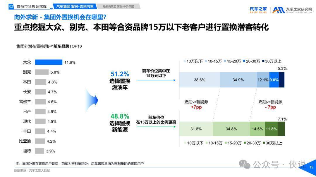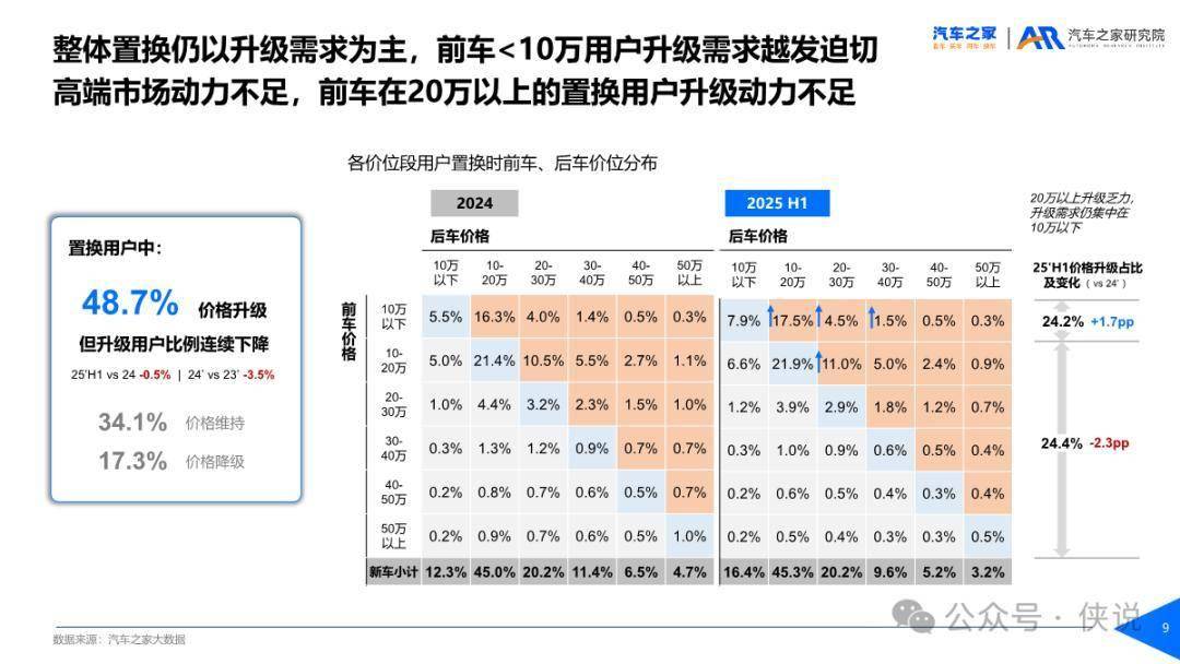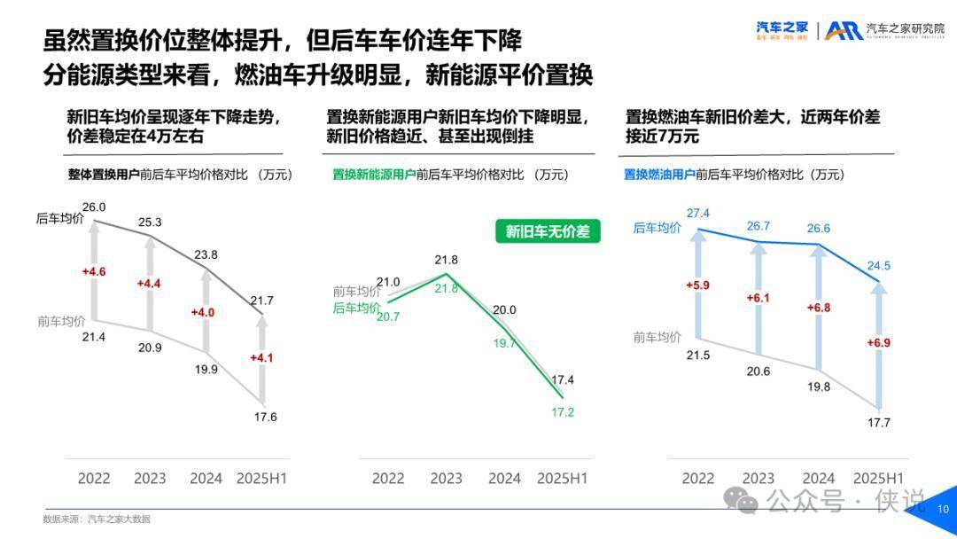 置换升级动力不足,虽整体价位提升,但后车车价连年下降,燃油车前后车价差近7万升级明显,新能源则平价置换,且20万以上高端升级动力弱,10万以下旧车升级需求迫切。