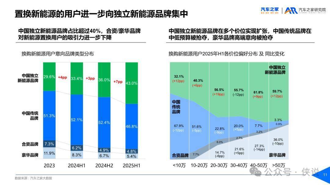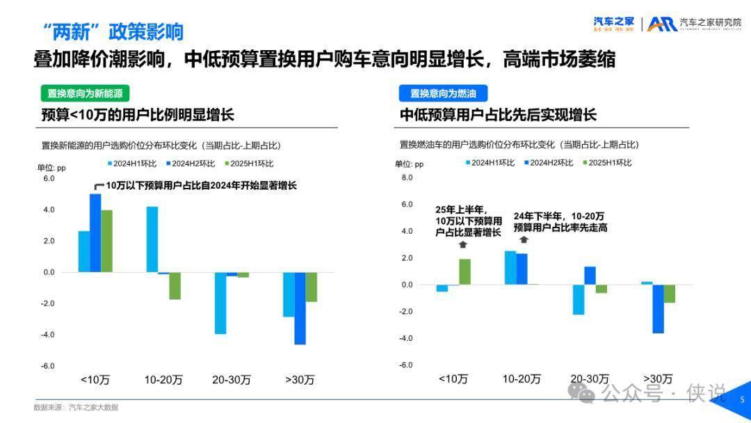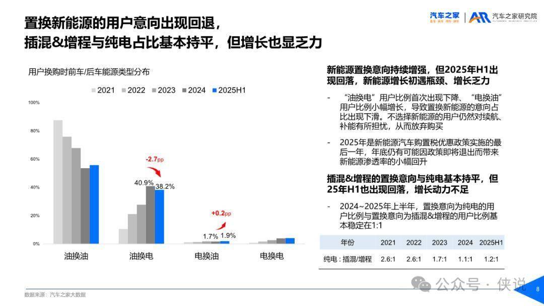 新能源置换遇瓶颈,“油换电”比例首次下降,“电换油”小幅增长,用户仍担忧续航和补能,不过2025年底或因购置税优惠退出出现小幅回升;插混&增程与纯电占比基本持平,但增长乏力。
