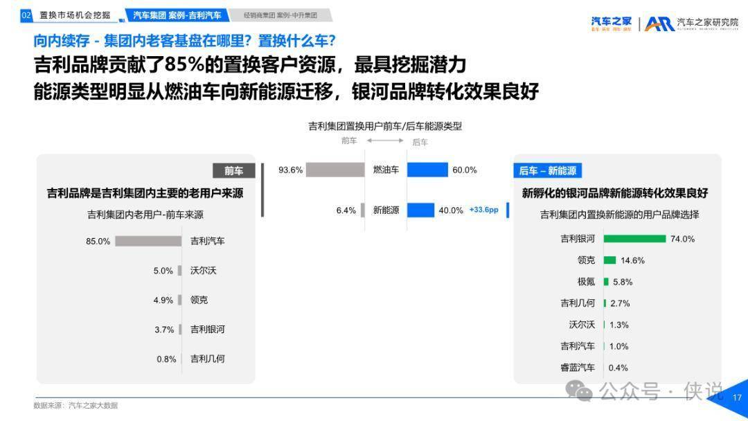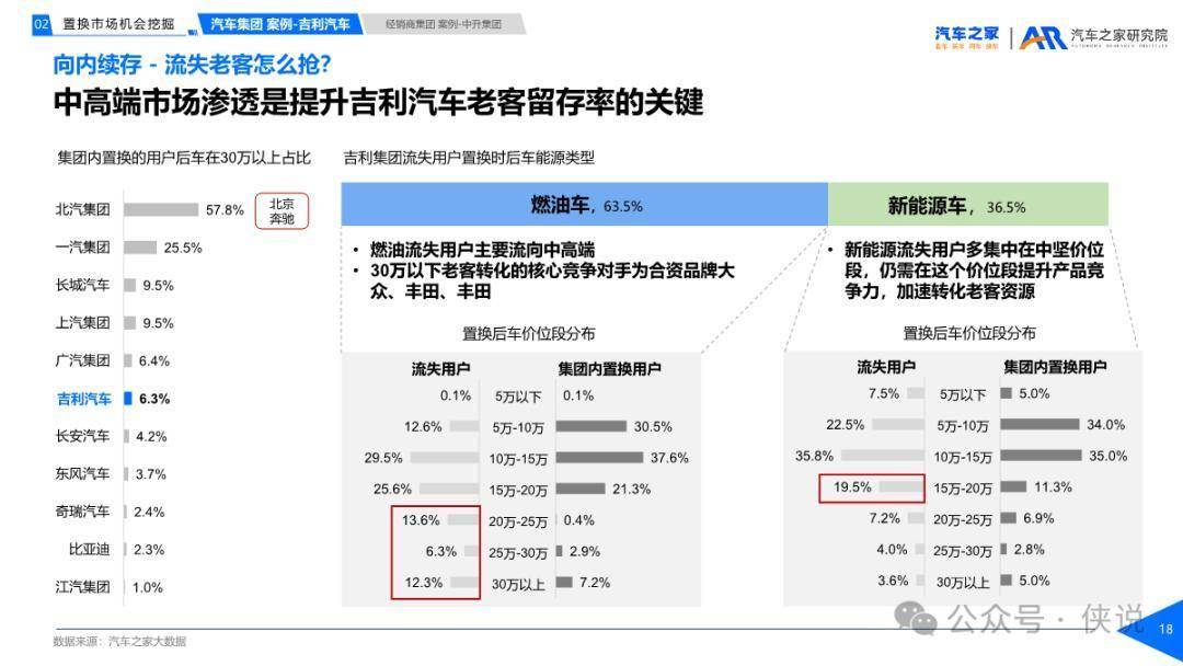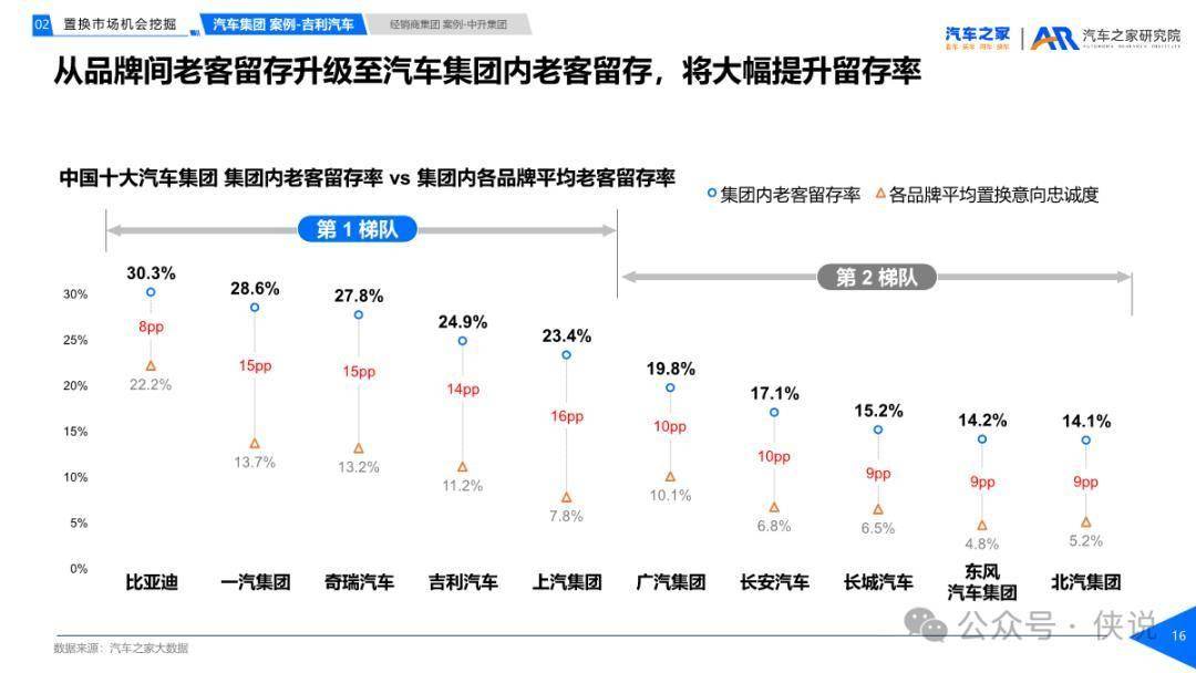 品牌忠诚度低,单一品牌置换意向忠诚度不足10%且持续下滑,而汽车集团内老客留存率多在20%左右,多品牌经营的集团更有优势。