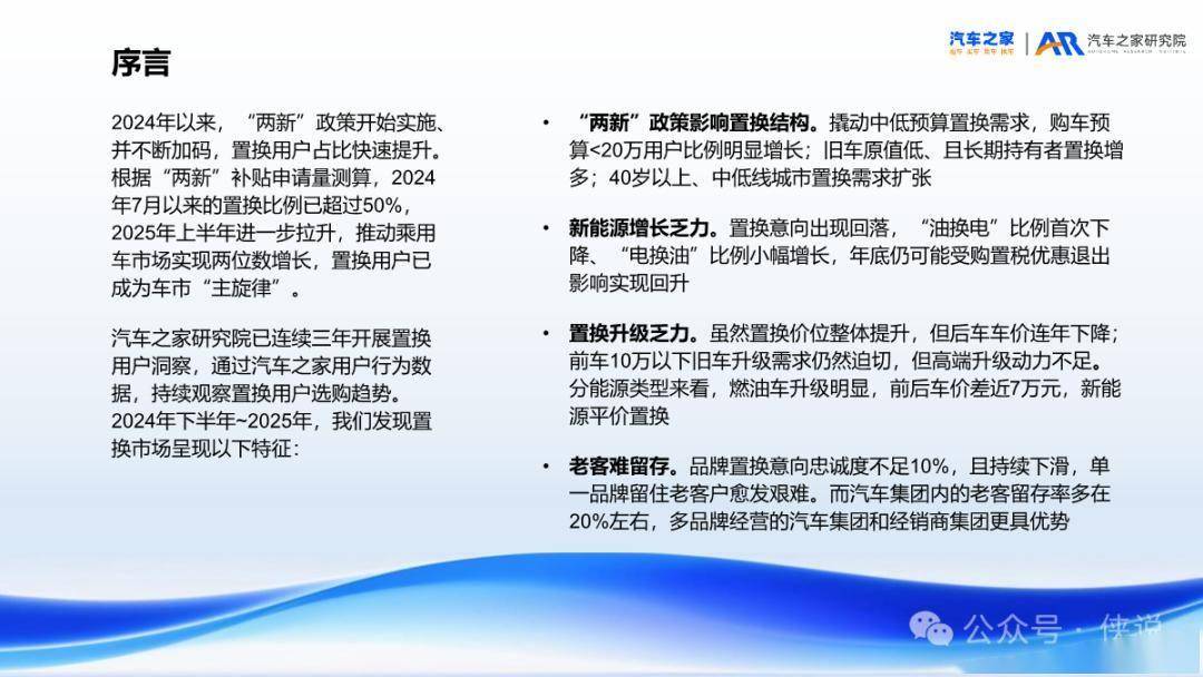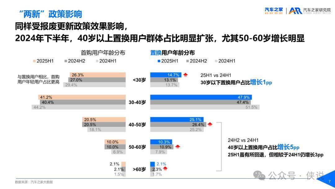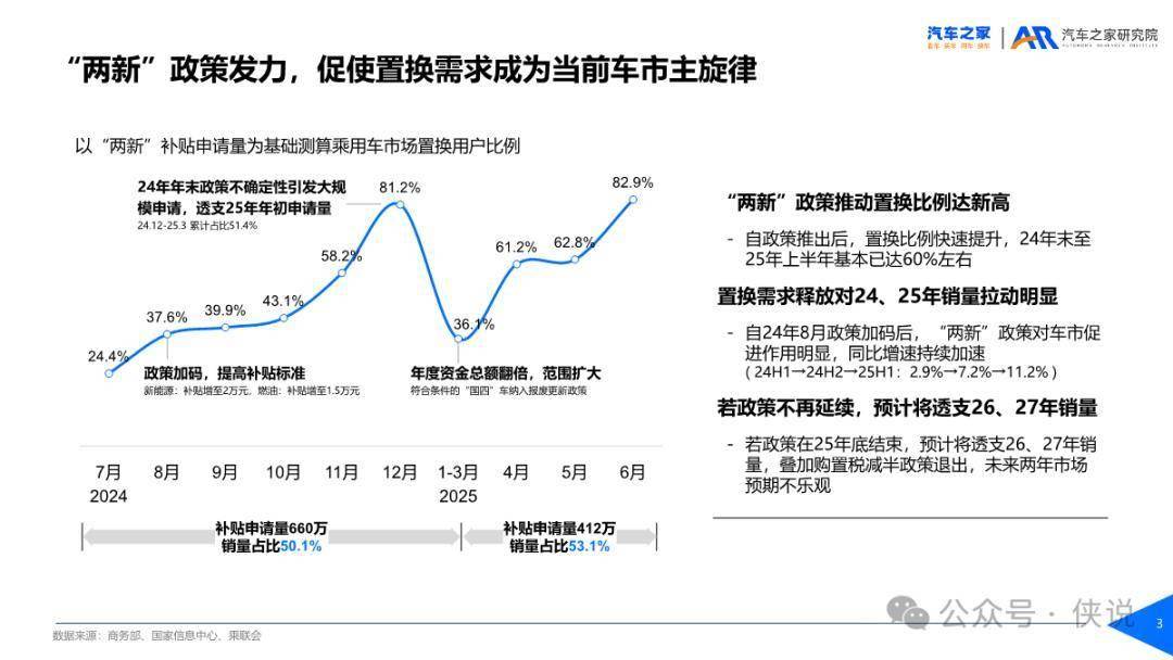2024年“两新”政策实施后,置换用户成车市主旋律,2024年7月置换比例超50%,2025年上半年进一步拉升,带动乘用车市场两位数增长。