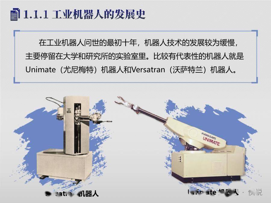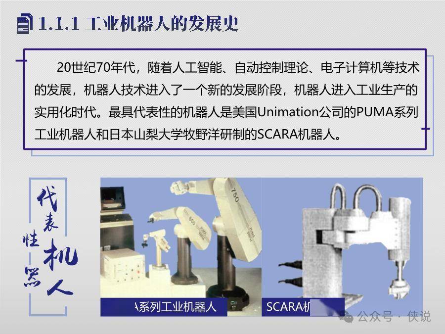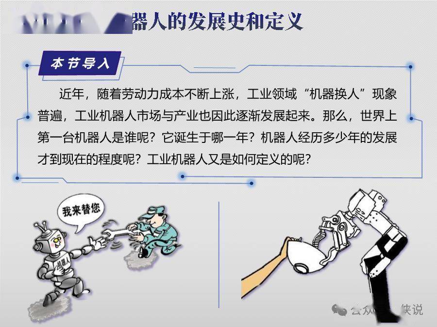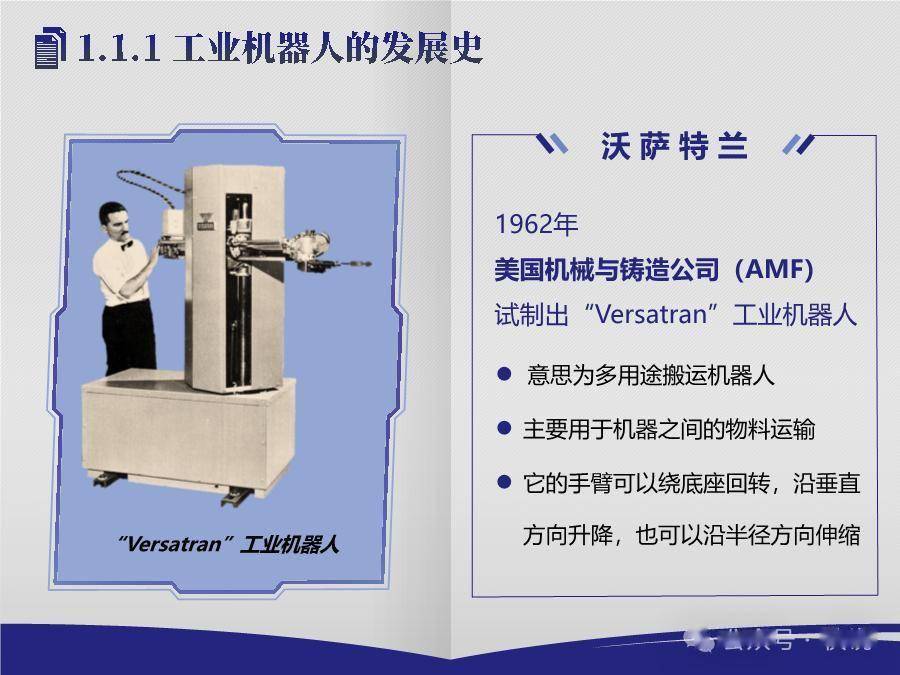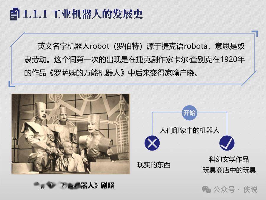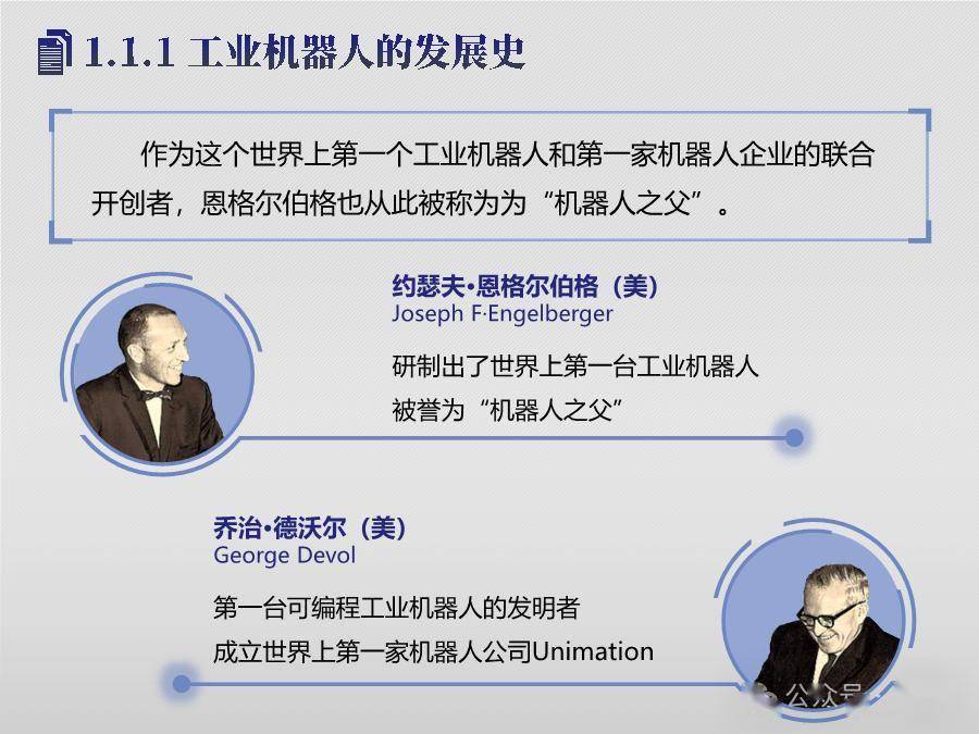 在发展史部分,“robot”源自捷克语“robota”(意为奴隶劳动),1920年首现于捷克剧作家作品;1950年代,美国的约瑟夫·恩格尔伯格和乔治·德沃尔造出世界第一台工业机器人Unimate(用于压铸的五轴液压驱动机器人),恩格尔伯格也被称“机器人之父”。
