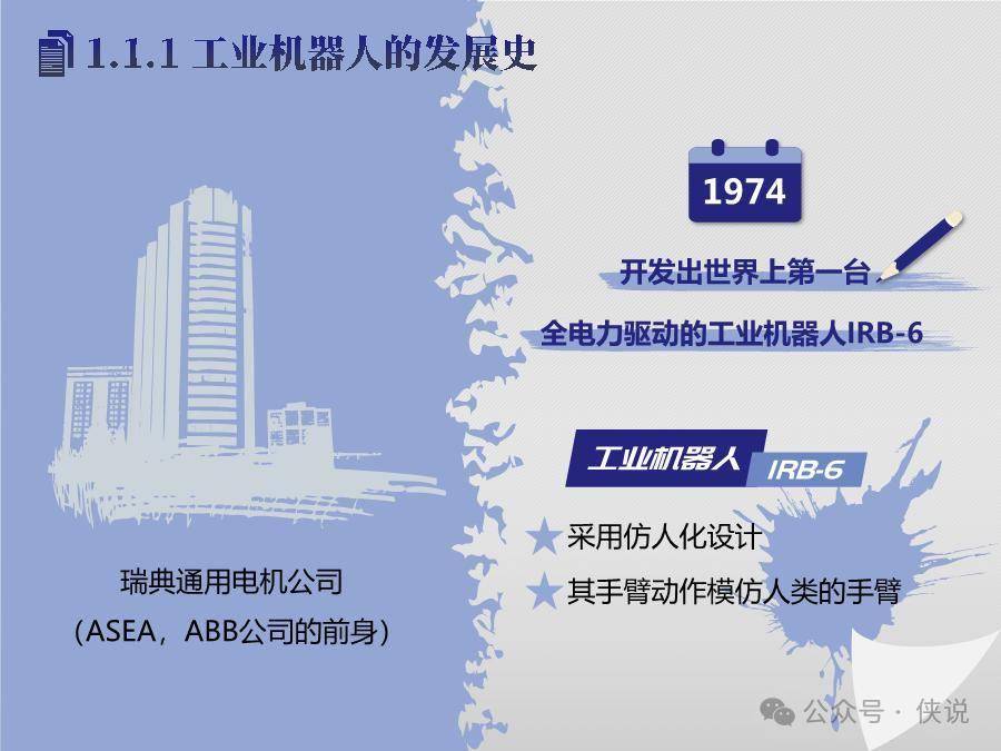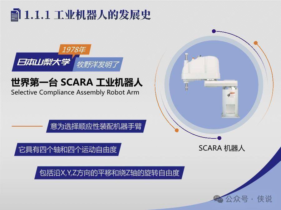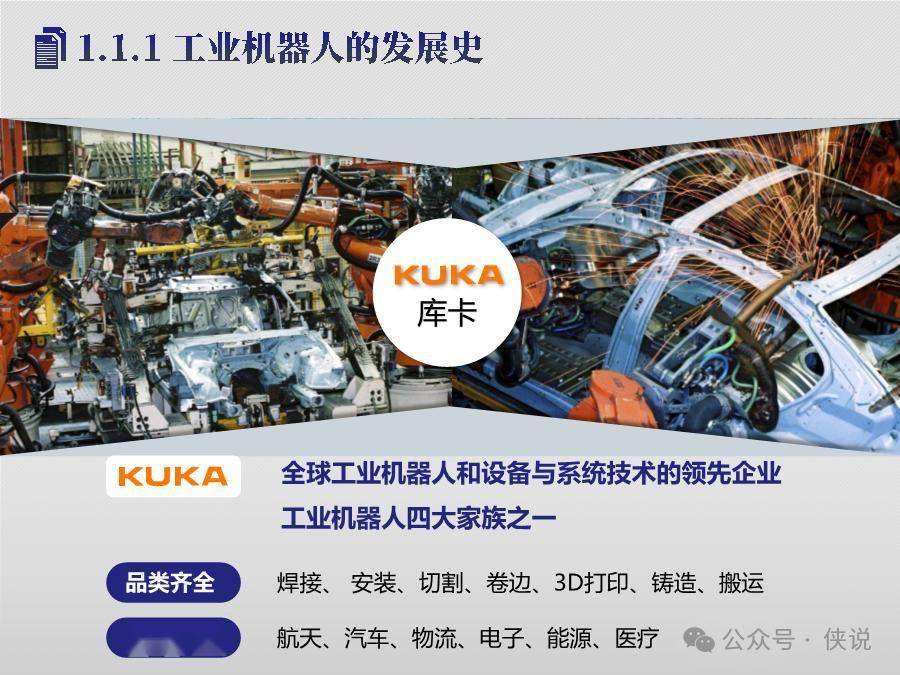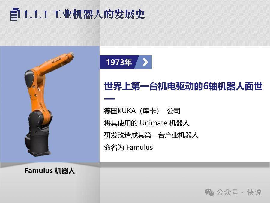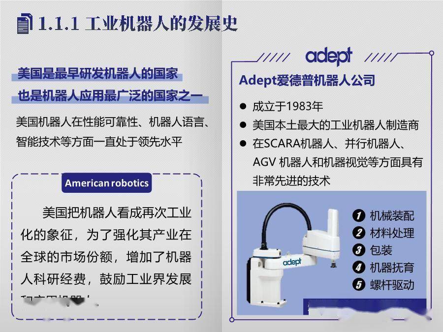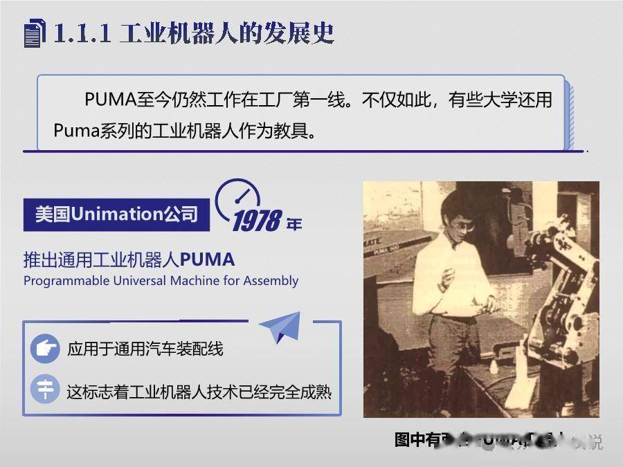 在发展史部分,“robot”源自捷克语“robota”(意为奴隶劳动),1920年首现于捷克剧作家作品;1950年代,美国的约瑟夫·恩格尔伯格和乔治·德沃尔造出世界第一台工业机器人Unimate(用于压铸的五轴液压驱动机器人),恩格尔伯格也被称“机器人之父”。