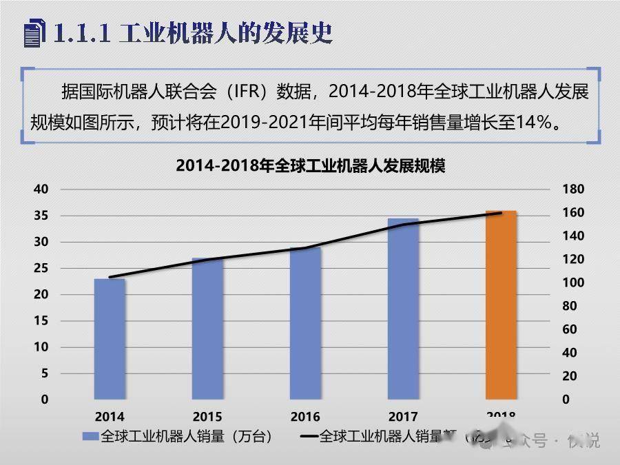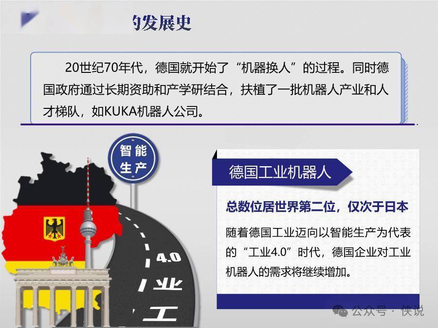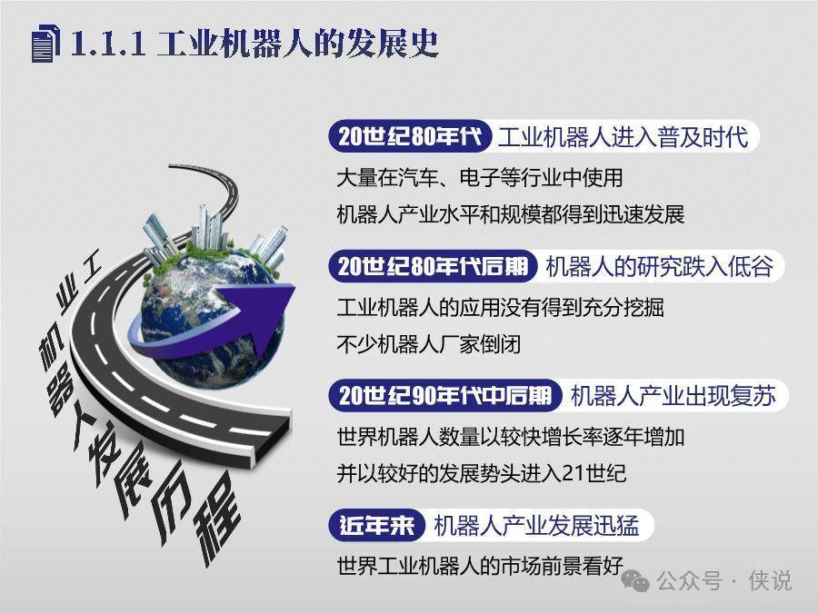 之后发展分阶段:最初十年技术缓慢,停留在实验室;1970年代随多技术发展进入实用化时代,出现PUMA系列、SCARA机器人等;后续有低谷也有复苏,2014 - 2018年全球销量增长,预计2019 - 2021年销量年均增14%。各国发展各有特点,美国在性能、智能技术等领先,日本后来居上成“机器人王国”,德国依托“工业4.0”需求增长,中国分理论研究、样机研发等阶段逐步发展。
