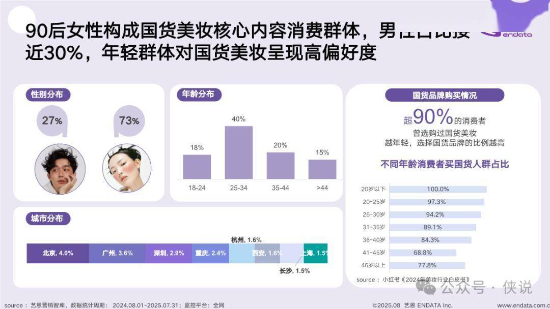 彩妆板块,主力也是年轻女性(74%女性、68%是18-34岁),高线城市对国货彩妆的认知度更高。底妆讨论度一直涨,现在还延伸到腮红、阴影这些高阶品类,花知晓、彩棠、橘朵是头部品牌。趋势上,“一物多用”(比如能当口红又能当腮红的产品)、细分赛道深耕(尔木萄靠粉扑、WOSADO靠磁吸睫毛突围)、“妆养合一”(花西子蜜粉、完美日记口红都加了养肤成分)这三点最明显。