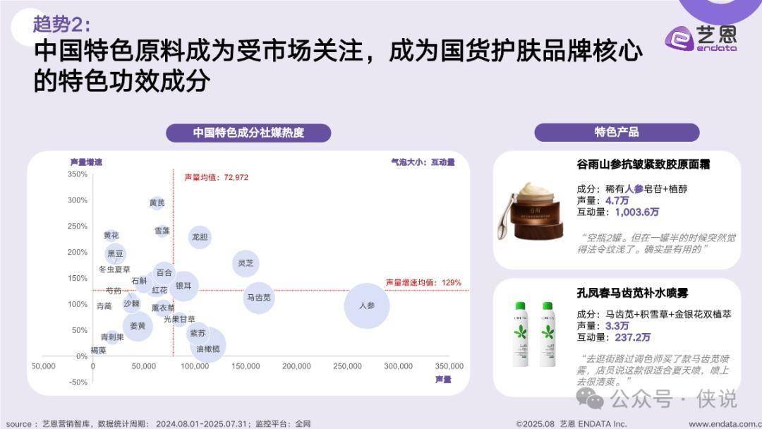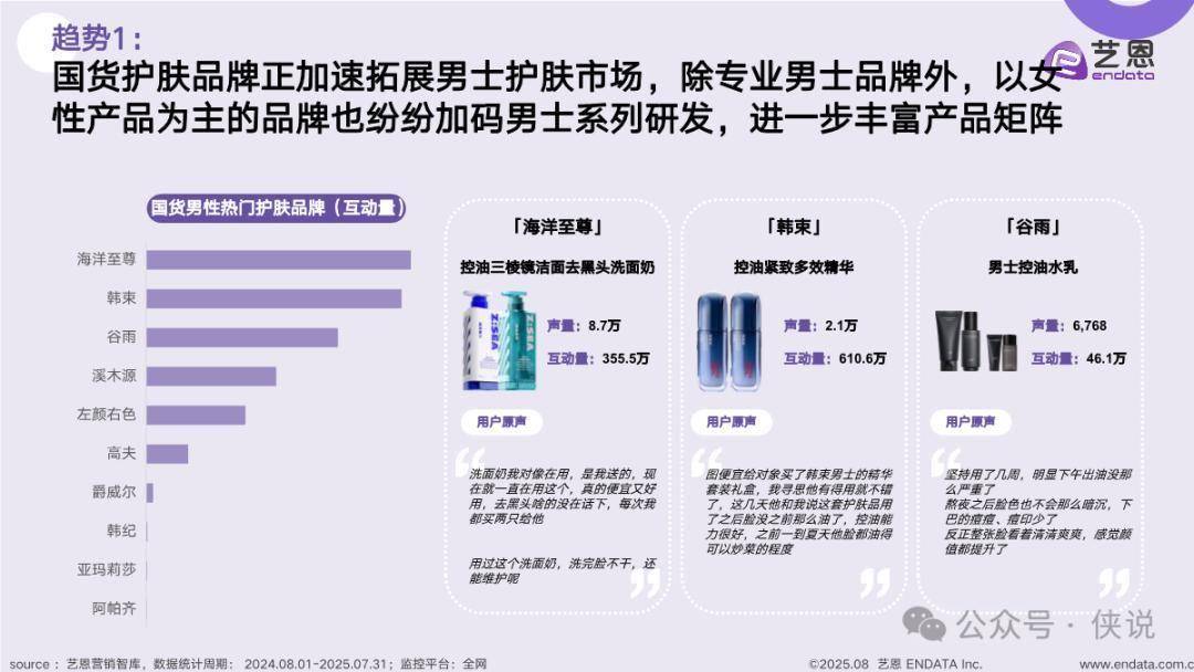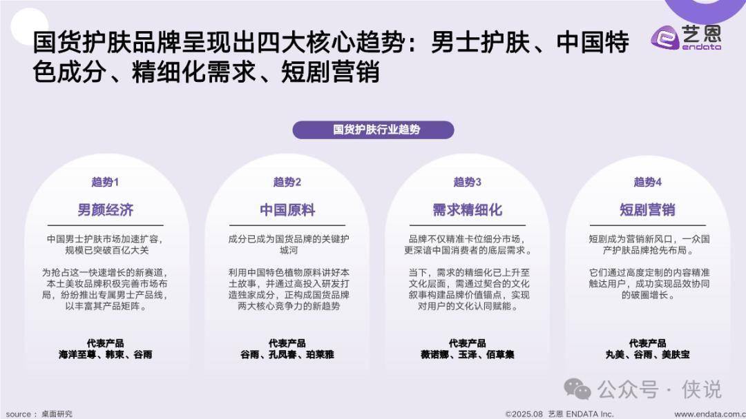 大家买国货护肤,最看重抗老、修复、美白,现在还出现了四大趋势:男士护肤(市场破百亿,海洋至尊、谷雨等都出了男士线)、中国特色成分(谷雨人参、孔凤春马齿苋,品牌还在加大研发搞自研成分)、需求精细化(比如薇诺娜专做敏感肌)、短剧营销(丸美、谷雨等投定制短剧,效果不错)。