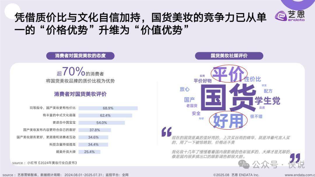 消费人群方面,90后女性是核心(占比73%),男性也快到30%了,而且越年轻越爱买国货,超90%消费者都选过国货美妆。大家认可国货,不只是因为便宜,更多是认“质价比”,还有中式文化底蕴、更适配中国肤质等,国货竞争力已经从“价格优势”升级成“价值优势”。