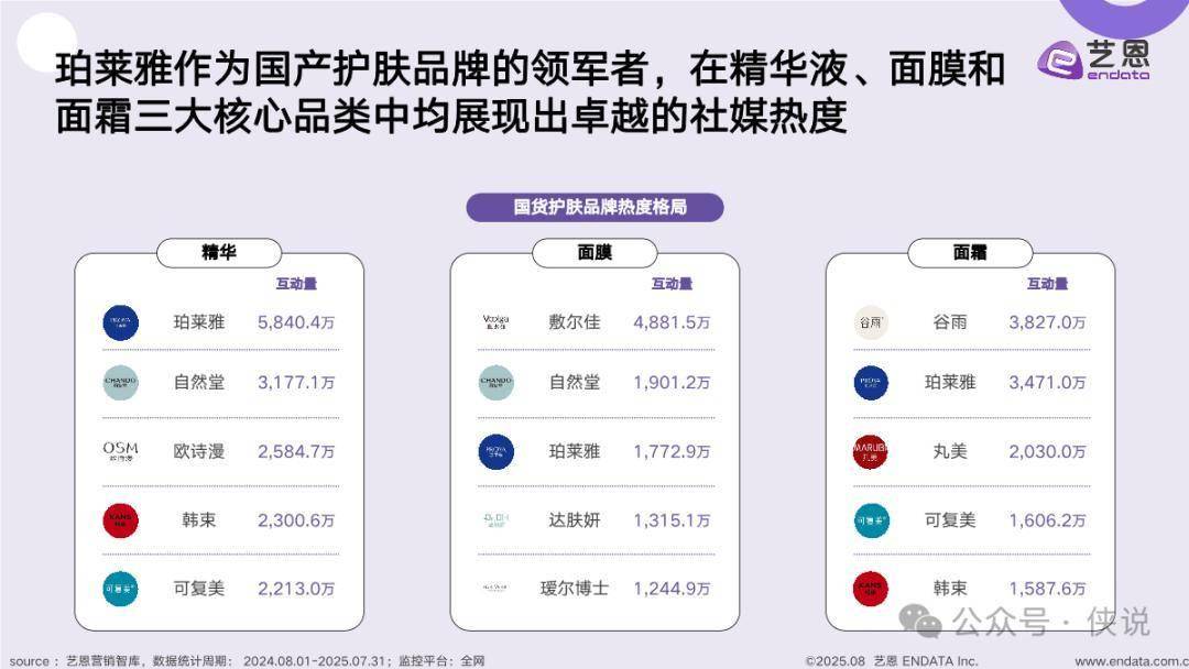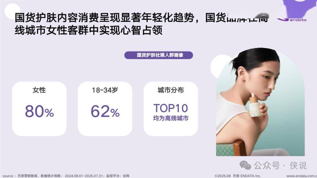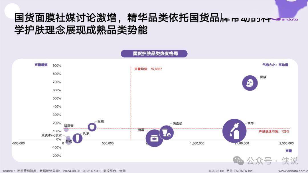护肤板块里,买国货护肤的主要是年轻女性(80%女性、62%是18-34岁),而且大多在高线城市。品类里面膜社媒讨论涨得最猛,精华靠“科学护肤”理念也很能打,珀莱雅在精华、面膜、面霜这三大核心品类里热度最高。