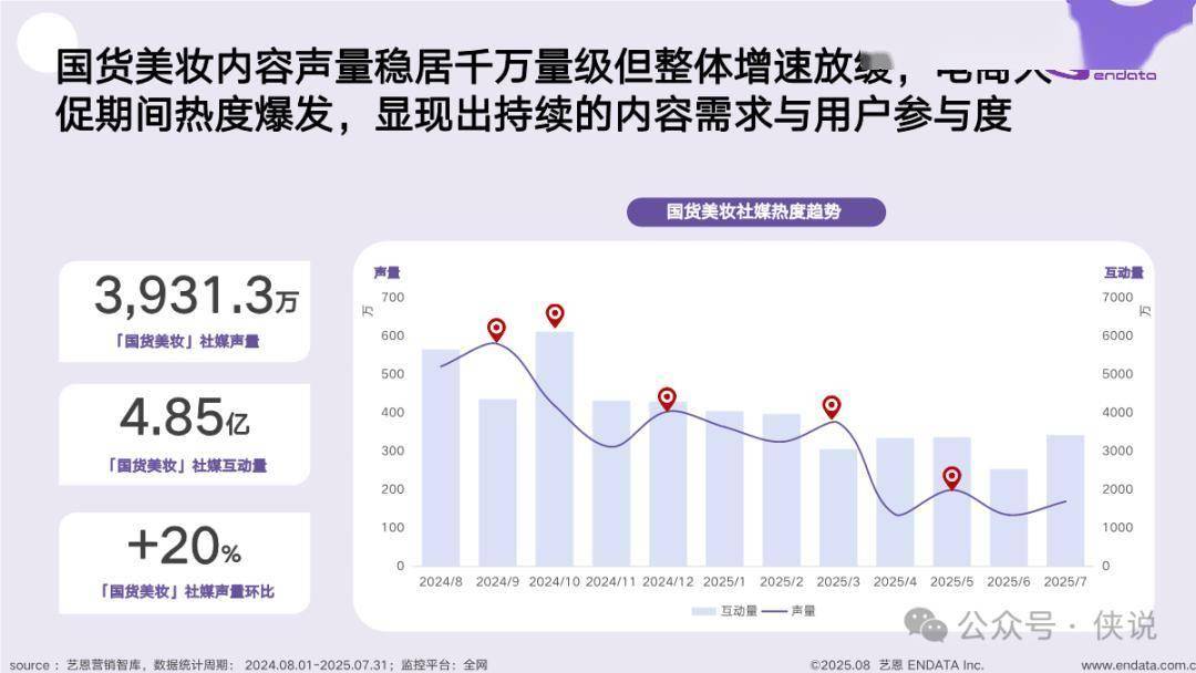 整体来看,中国美妆市场保持增长且进入平稳期,国货正在加速抢市场——2024年国货美妆市占率达55.2%,已经超过外资品牌。社媒上,“国货美妆”声量稳定在千万级(3931.3万)、互动量4.85亿,虽然整体增速放缓,但电商大促期间热度会爆发,用户参与度一直在线。