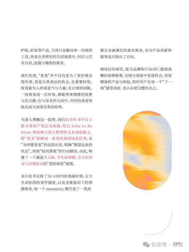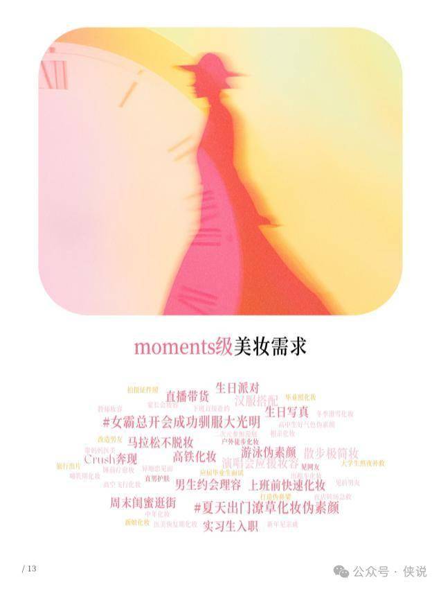 最后,白皮书通过“美的进化全景”(5大维度10个趋势)和“美的万千moments”(如打工人课间补妆、度假出片、闺蜜同步变美等具体场景+需求方案),为品牌提供产品开发和营销方向,核心是让品牌深入生活现场,用情境化产品对接用户真实需求。