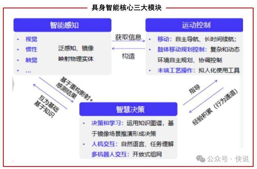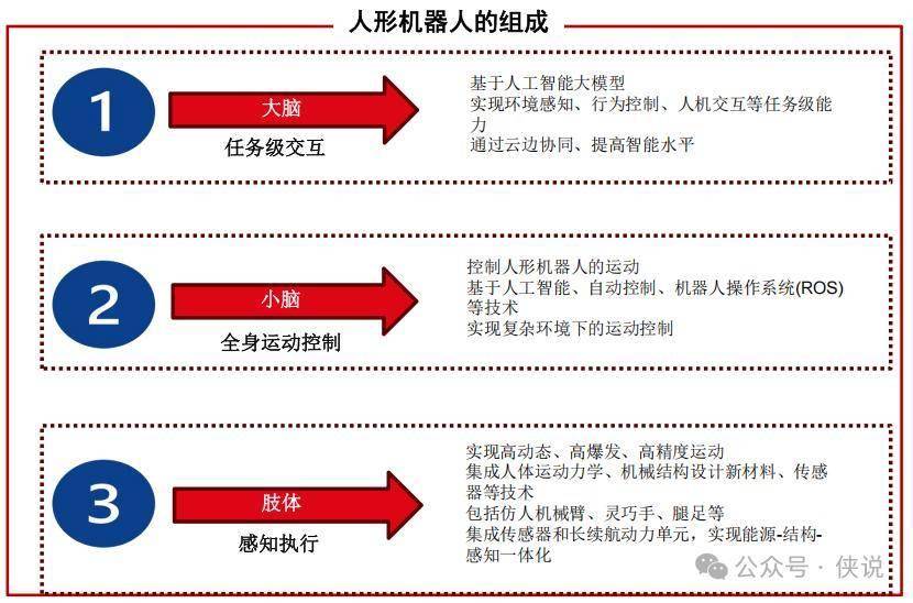就像人一样,要完成“拿个苹果”这个动作,得先“看到”苹果(感知)、“想”怎么伸手(决策)、再“控制手指用力”(执行)——机器人也得有这套系统,只不过叫“大脑”“小脑”和“肢体”。