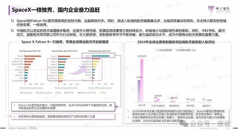 全球商业航天发展分三步走:早期政府绝对主导(1950s-1980s),后来政策松绑民间入场(1980s-1990s),现在进入SpaceX引领的“新航天”时代。2024年全球近70%的火箭发射靠民营企业,其中SpaceX一家独大,中国航天(国家队+民企)紧随其后奋力追赶。