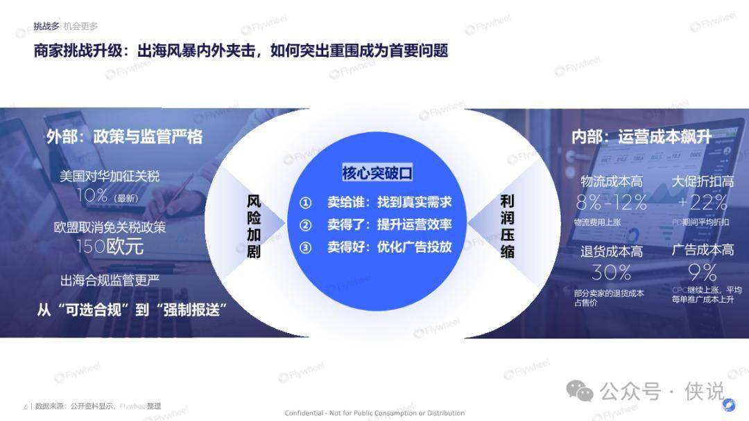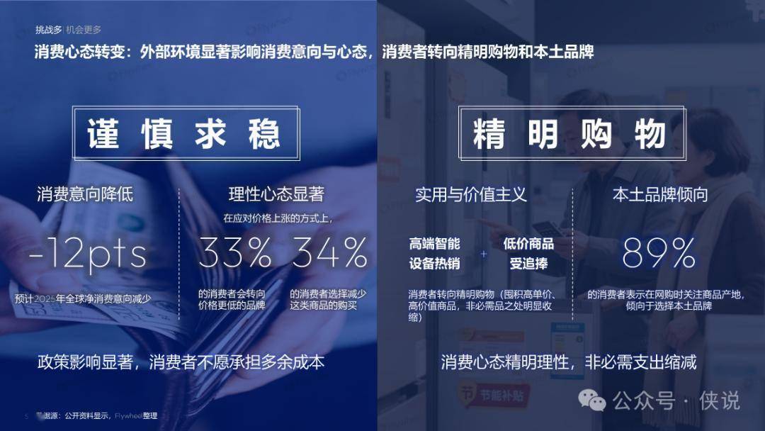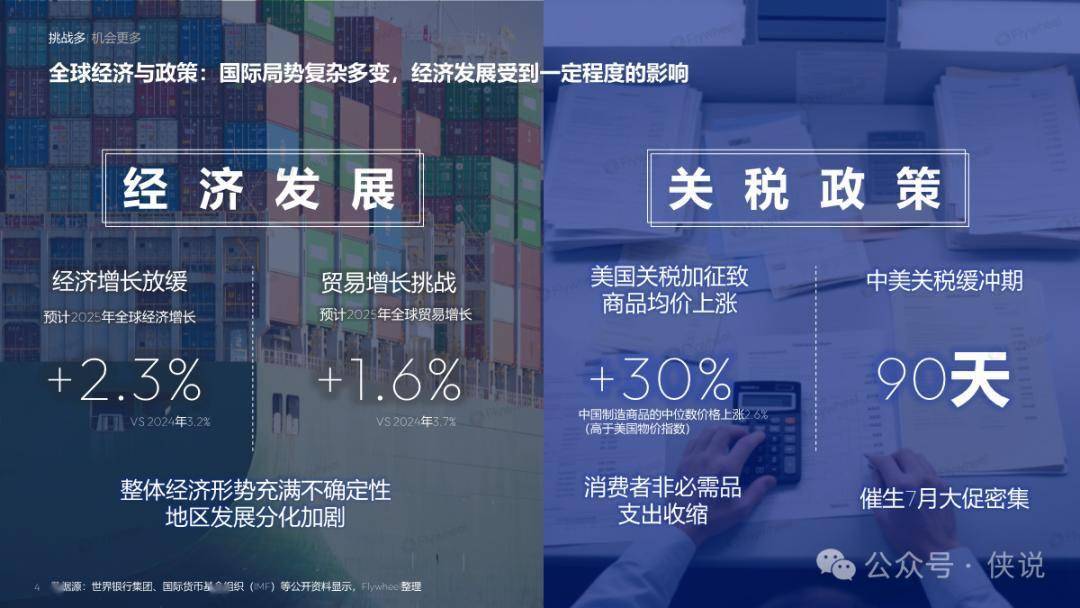 2025年跨境电商面临“挑战多、机会更多”的局面:全球经济增长预计2.3%、贸易增长1.6%,美国对华加征10%关税致商品均价涨30%,中国制造商品中位数价涨2.6%,消费者理性化(89%关注本土品牌,全球净消费意向降12pts),商家承压于物流成本8%-12%、退货成本30%等。