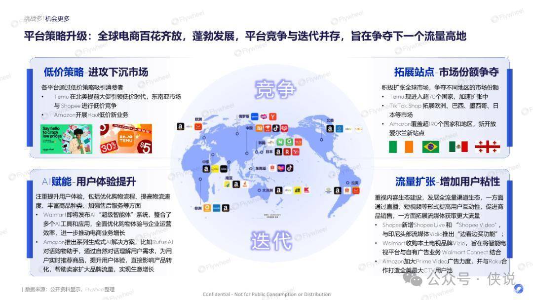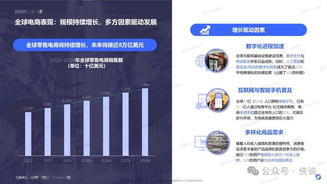 但全球电商规模持续扩张,2022-2028年零售电商销售额将接近8万亿美元,数字化、互联网普及等为核心驱动力,平台以AI赋能、低价策略、拓站点争夺流量。