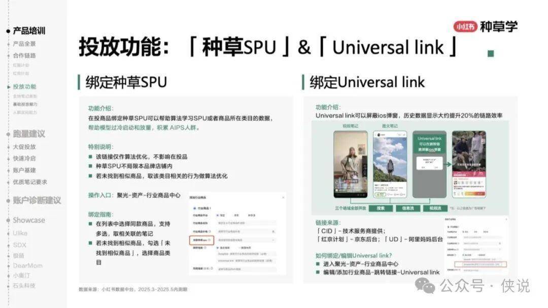 还有保浅优深(冷启和大促蓄水用)、托管(自动调优拿量,比非托管多20%流量)、绑定种草SPU(帮算法冷启)、Universal link(提升iOS跳转效率)这些实用工具。