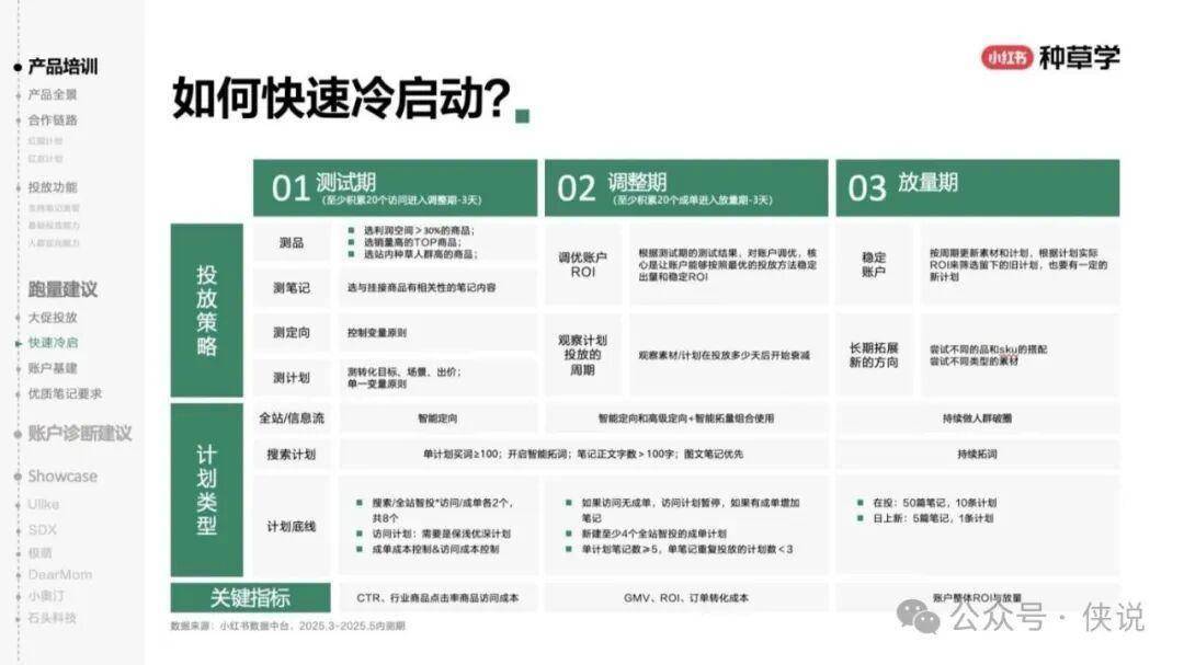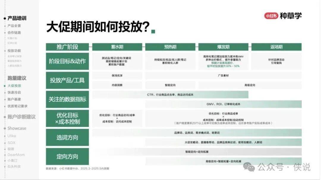 跑量建议很具体:大促分蓄水、预热、爆发、返场四阶段,比如爆发期要给高转化笔记加投、提价30%-50%;快速冷启分测试、调整、放量三阶段,按步骤积累访问和成单数据。