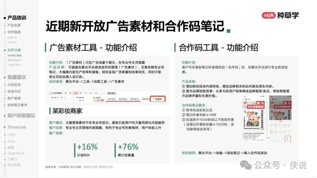 投放上支持蒲公英合作笔记、专业号笔记等6种笔记类型,新开放的广告素材能在专业号主页隐藏,避免用户看腻营销内容,合作码笔记适合1000粉以下素人投流,能增加原生内容供给。