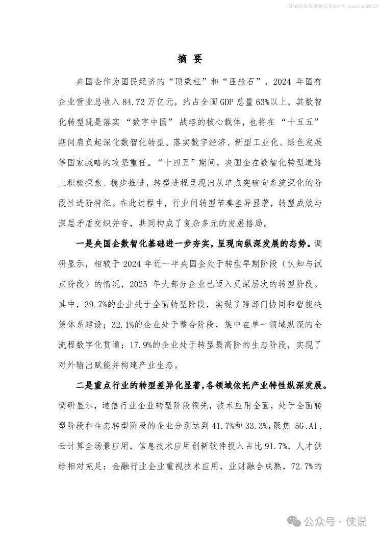 央国企作为国民经济的“顶梁柱”,2024年营业总收入达84.72万亿元,占全国GDP超63%,其数智化转型是落实“数字中国”战略的核心,也将在“十五五”期间承担起深化转型、推进数字经济等国家战略的重任。
