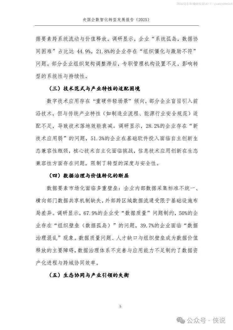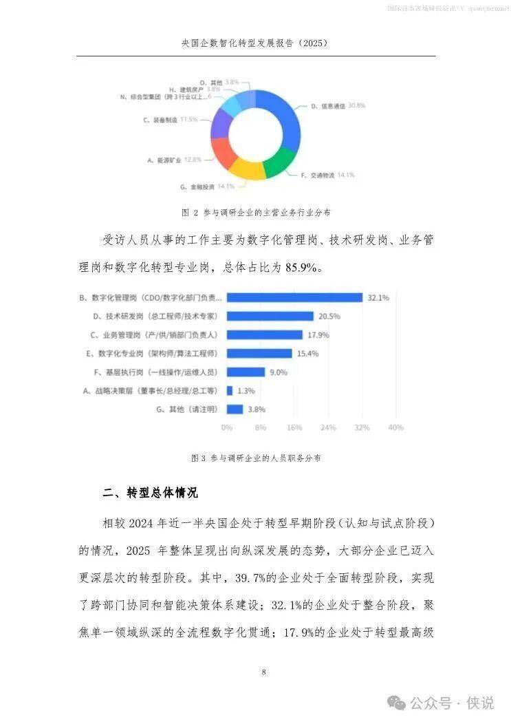 2025年,央国企数智化转型基础更扎实,多数企业迈过早期阶段:39.7%进入全面转型阶段,实现跨部门协同与智能决策;32.1%处于整合阶段,聚焦单一领域全流程数字化;17.9%达生态阶段,能对外赋能构建产业生态。