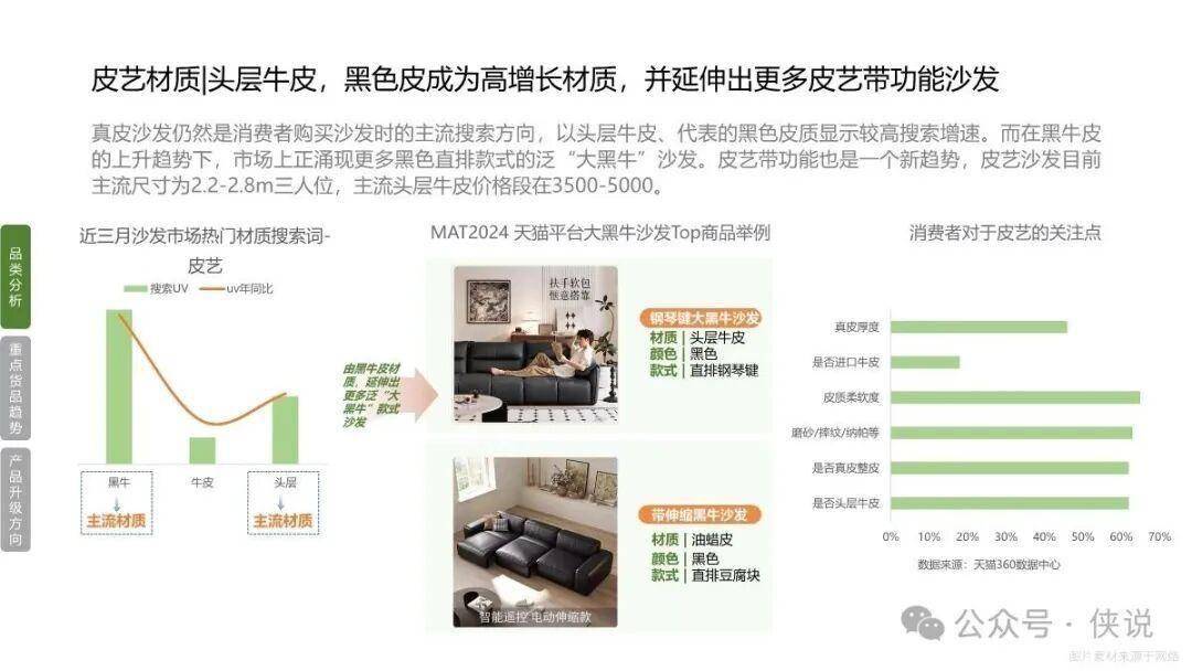 重点品类里,沙发领域皮艺体量已经超过布艺,大黑牛款、功能沙发卖得好;床类皮 艺成主流,黑胡桃木、头层牛皮材质受欢迎,悬浮床、电动智能床增速高;桌类里实木餐桌、电动升降桌、家用茶桌是增长主力,小户型还特别青睐岛台餐桌;柜类则是复古风主导,智能床头柜、组合柜需求上升,环保实木和金属材质也很受青睐。